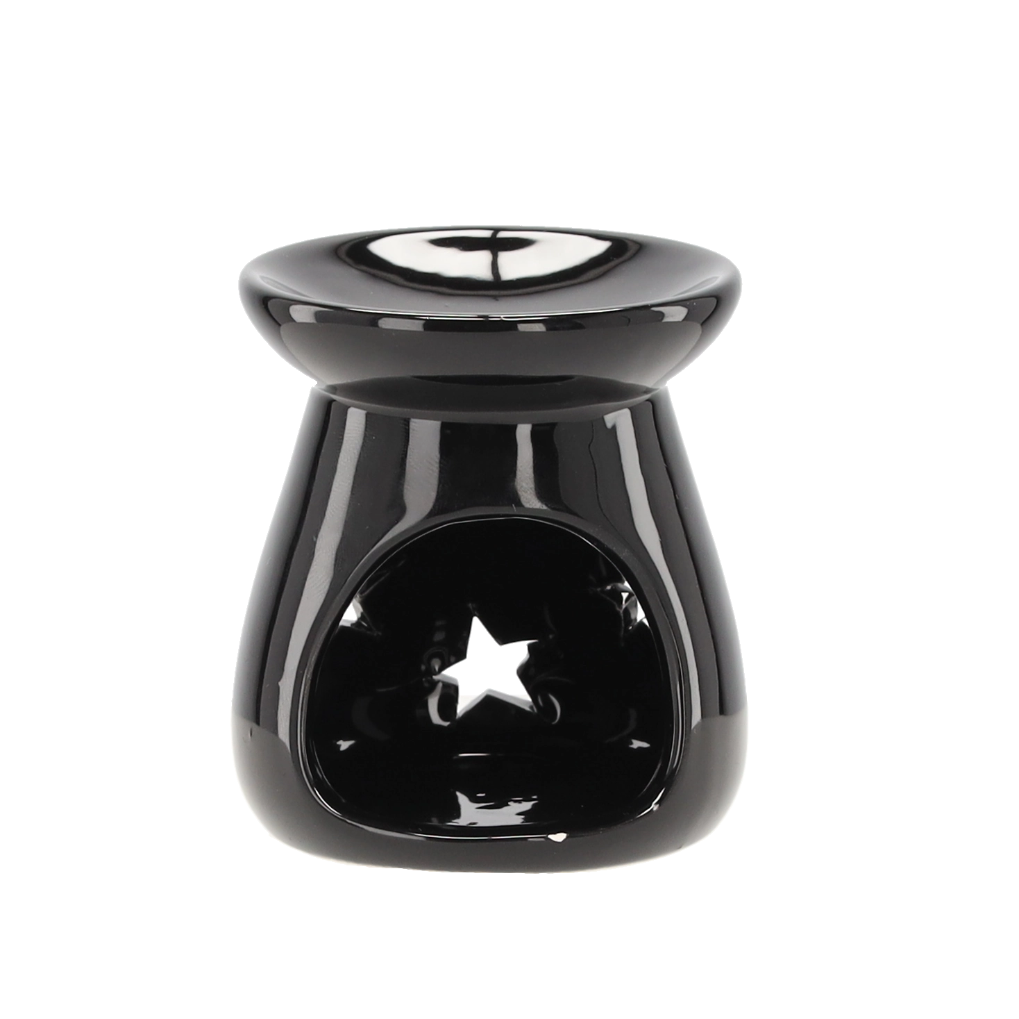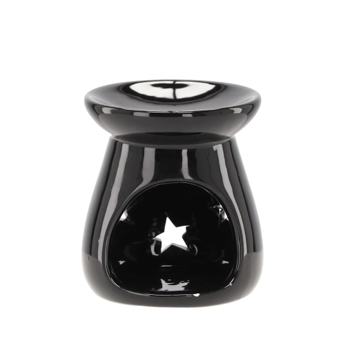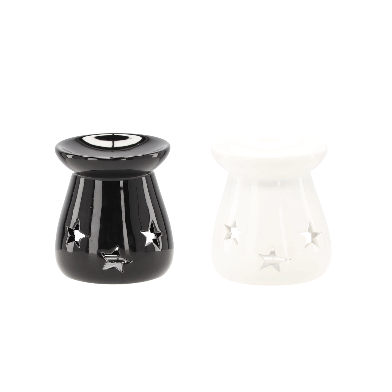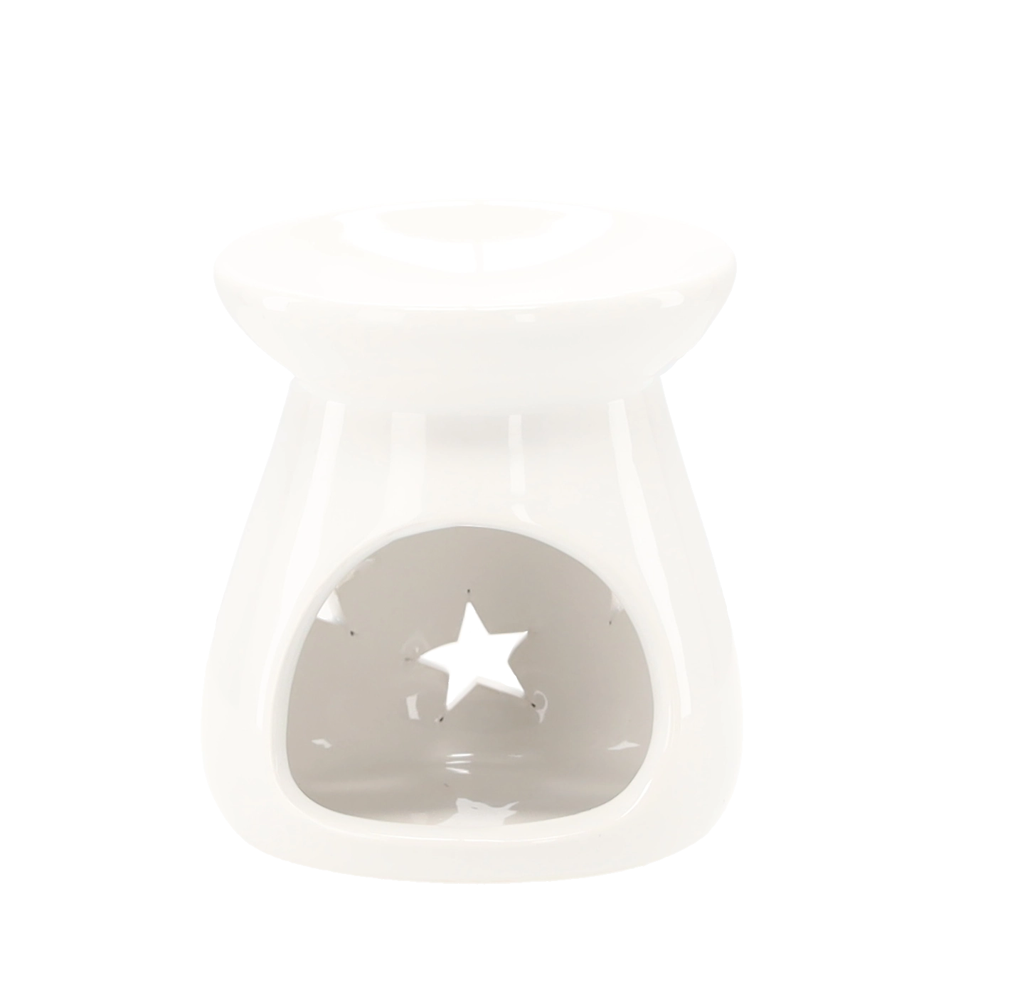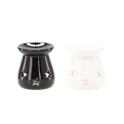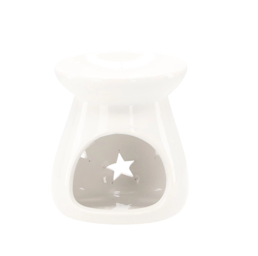 Stylová aromalampa z glazované keramiky přináší jemné světelné efekty díky výřezům ve tvaru hvězd. Horní miska je určená pro vonný vosk nebo esenciální oleje, spodní otvor pojme klasickou čajovou svíčku. Kompaktní rozměry 7 × 8 cm umožní umístění na poličku, konferenční stolek i parapet.