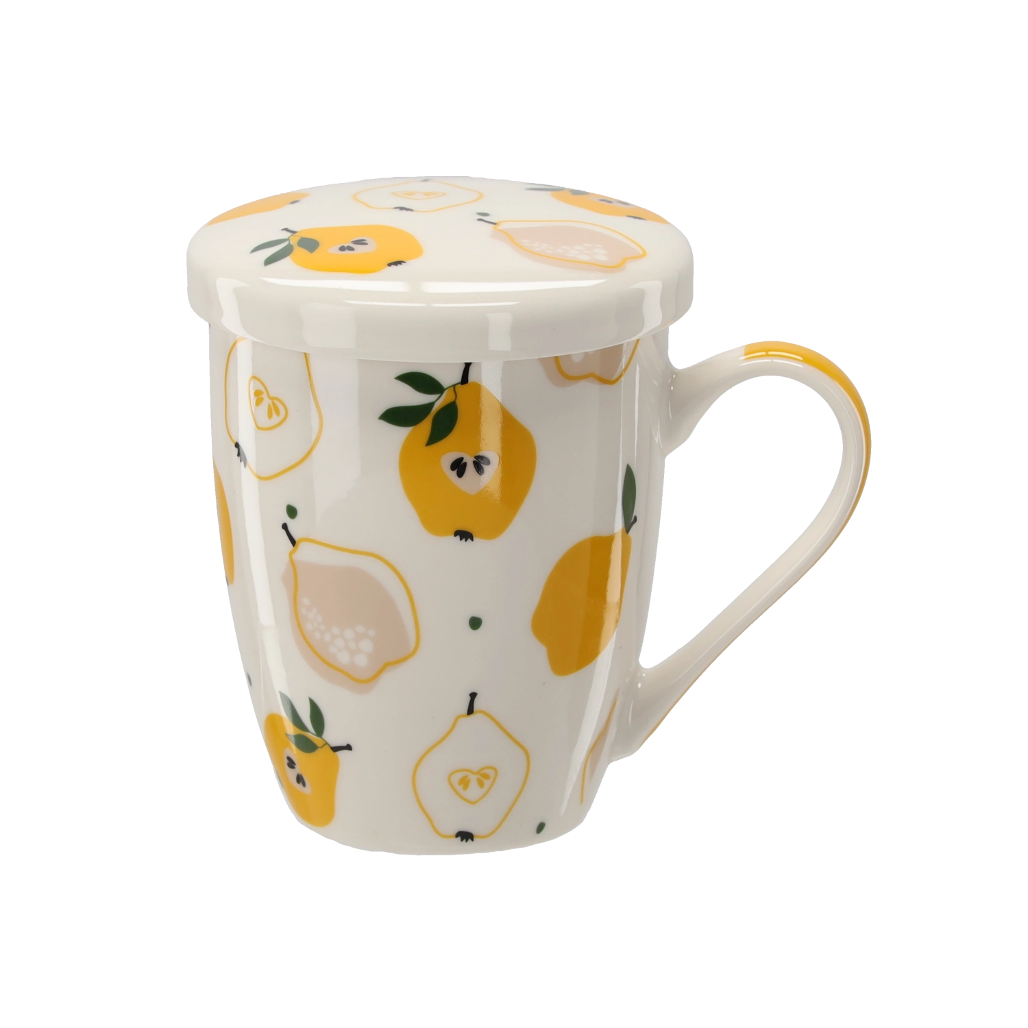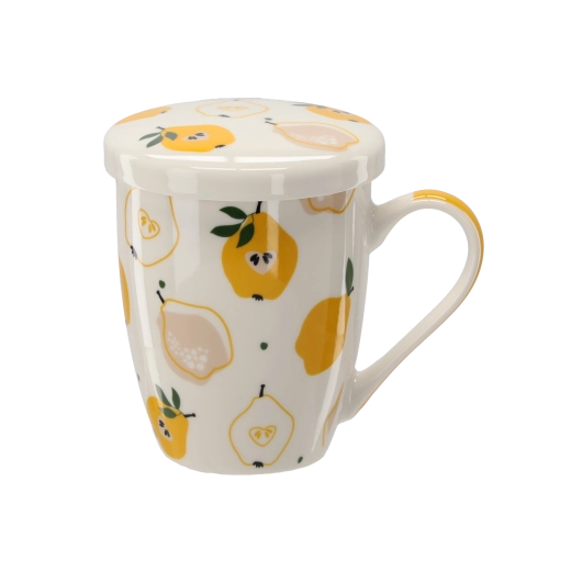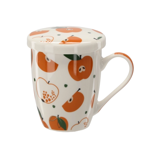 Stylový porcelánový hrnek o objemu 340 ml s integrovaným sítkem a víčkem je ideální pro každodenní popíjení čaje i bylinkových nálevů. Díky jemnému sítku připravíte sypaný čaj bez nečistot, zatímco víčko udrží nápoj déle teplý. Kvalitní porcelán, ergonomické ucho a svěžím ovocné motivy z něj dělají praktický i krásný doplněk do kuchyně.