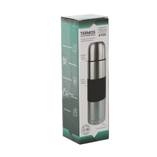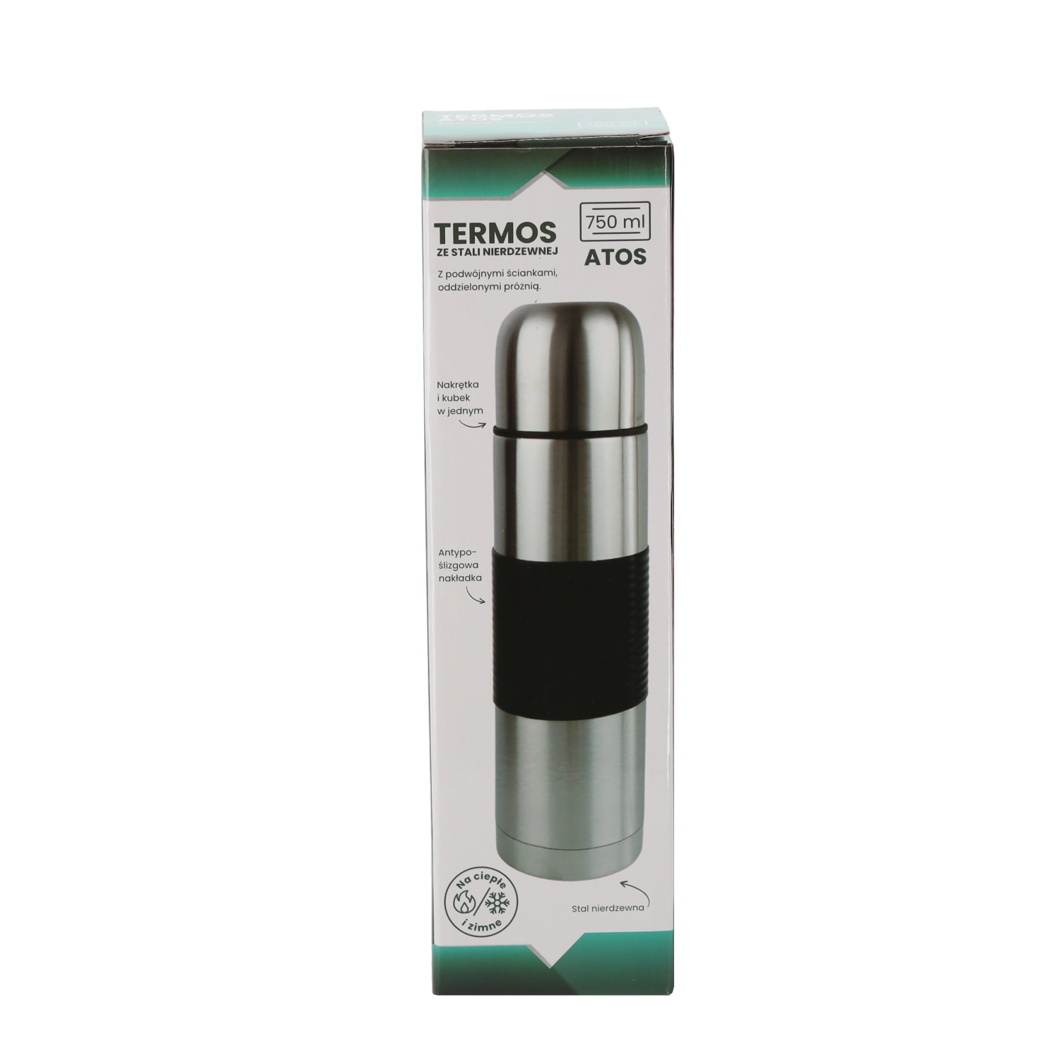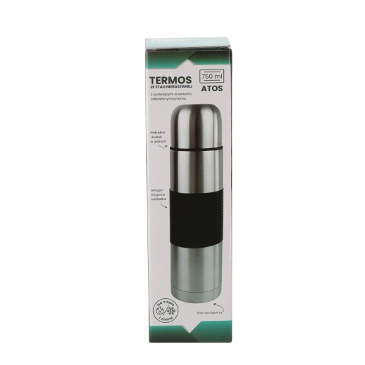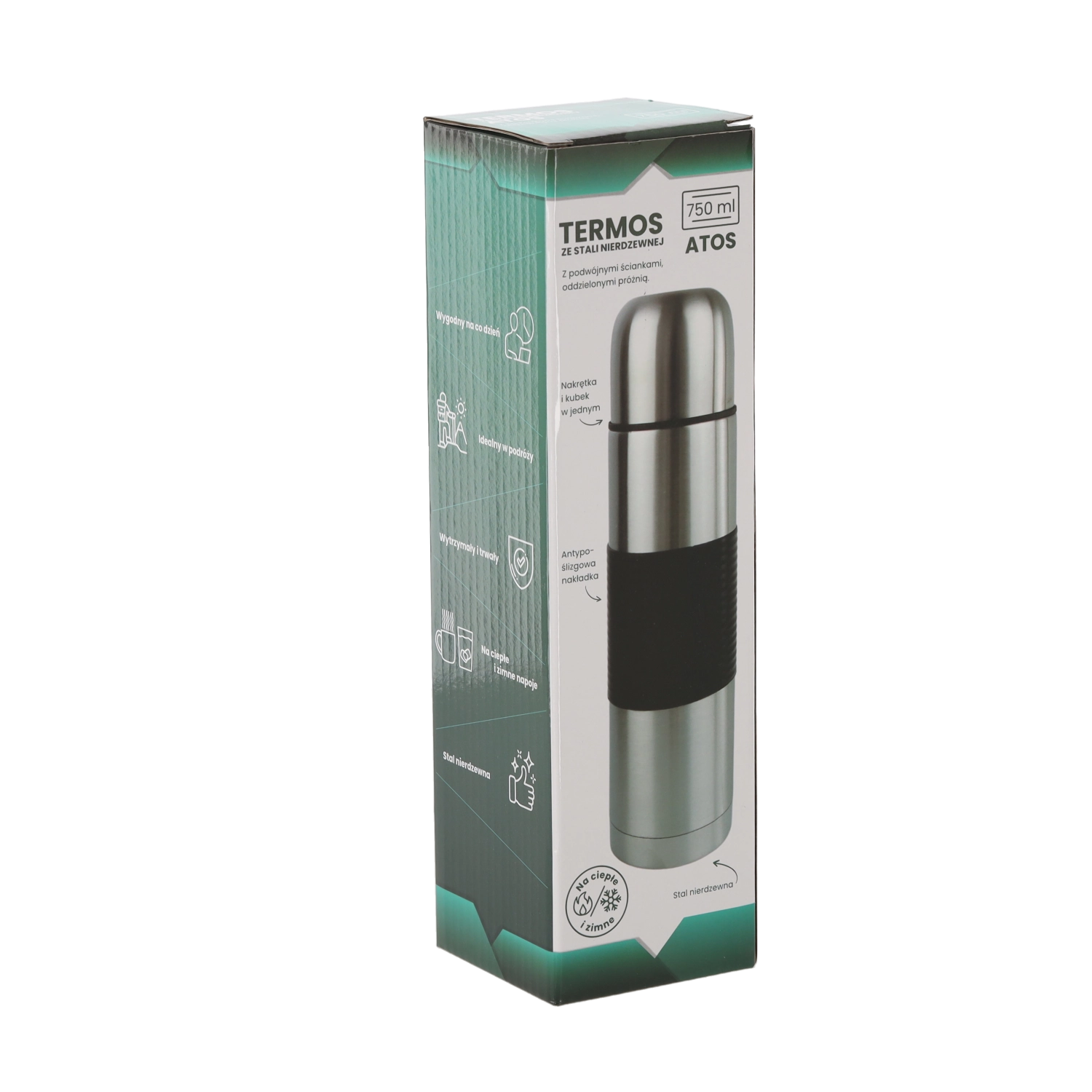Praktická termoska ATOS o objemu 750 ml udrží váš nápoj dlouho teplý i studený díky dvojitým nerezovým stěnám a pohodlnému protiskluzovému silikonovému úchopu. Vysoká tepelná izolace zajistí, že i po 24 hodinách zůstane nápoj příjemně teplý.
