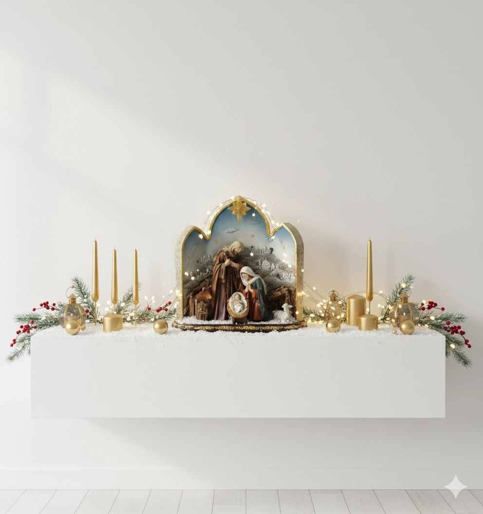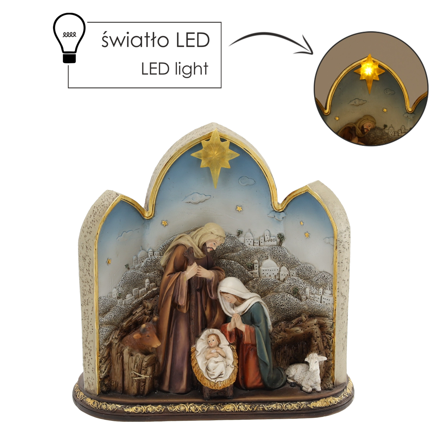 Vneste do domova kouzlo Vánoc s elegantní figurkou betlému se Svatou rodinou v katedrálním oblouku. Zabudovaná LED hvězda vytváří teplé, útulné světlo a zvýrazní jemné detaily dekorace. Ideální jako stolní vánoční ozdoba do obýváku, na komodu či parapet.