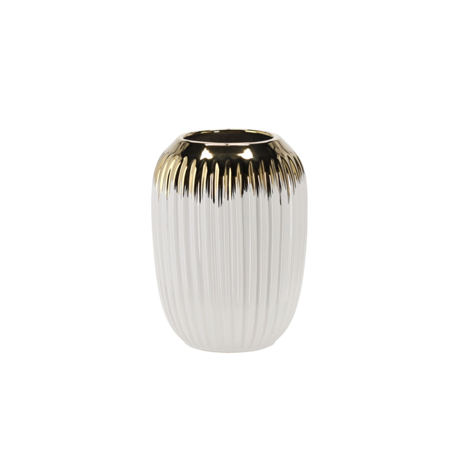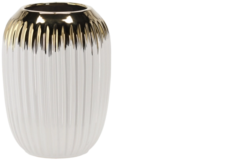 Tato stylová bílo‑zlatá váza zvýrazní krásu čerstvých i sušených květin a zároveň působí jako výrazný dekorativní prvek. Keramické zpracování v kombinaci s lesklým zlatým akcentem podtrhuje moderní i klasický interiér.
