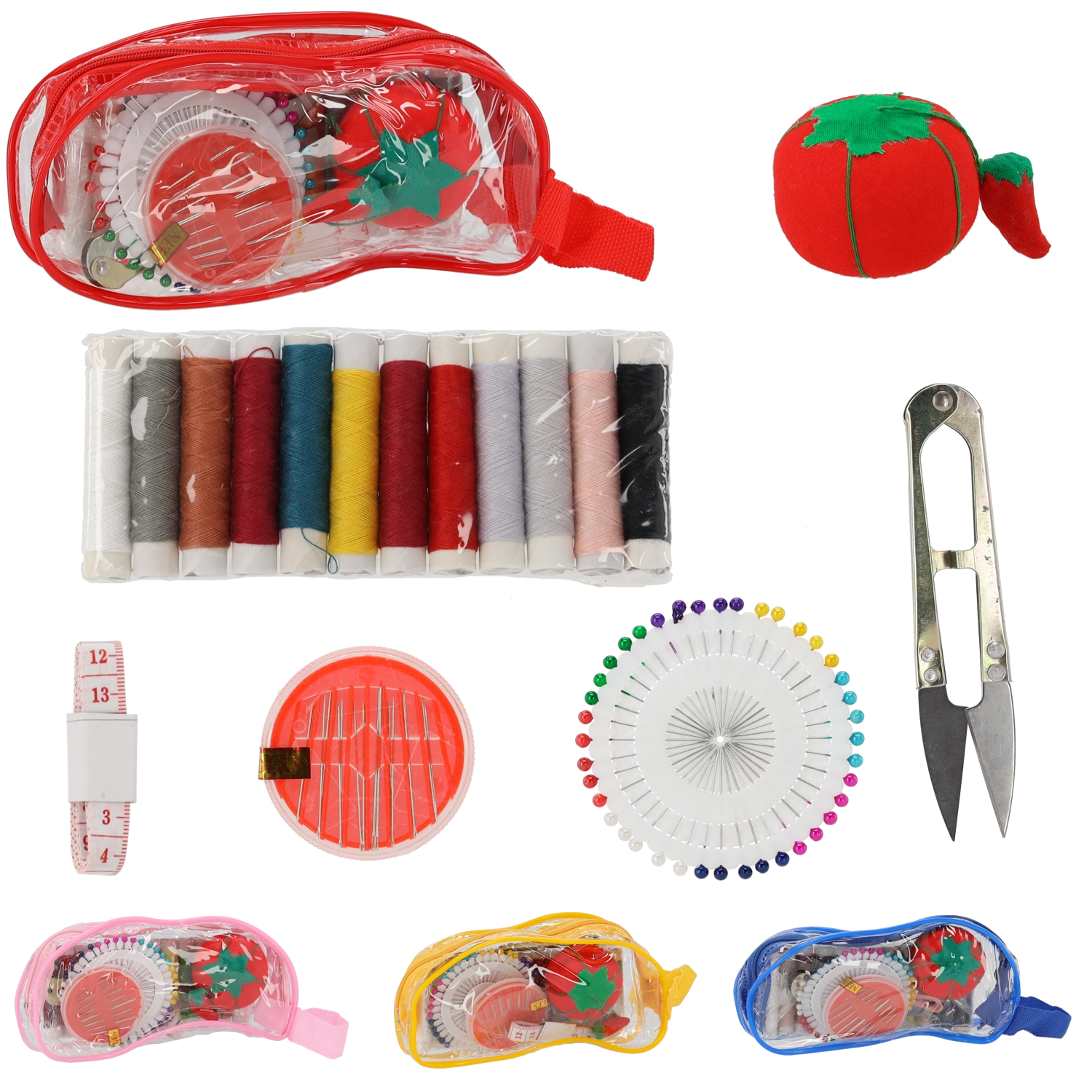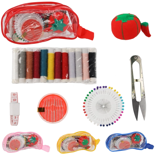 Součástí balení jsou různobarevné nitě, praktický krejčovský metr, ostré nůžky, sada jehel a špendlíky s perlovými koncovkami, které se snadno používají a dobře vidí při práci. Jehelníček bezpečně uchová jehly na jednom místě a usnadňuje manipulaci. Sada je skvělá pro začátečníky i pokročilé a hodí se do domácnosti, kanceláře, auta i na dovolenou.