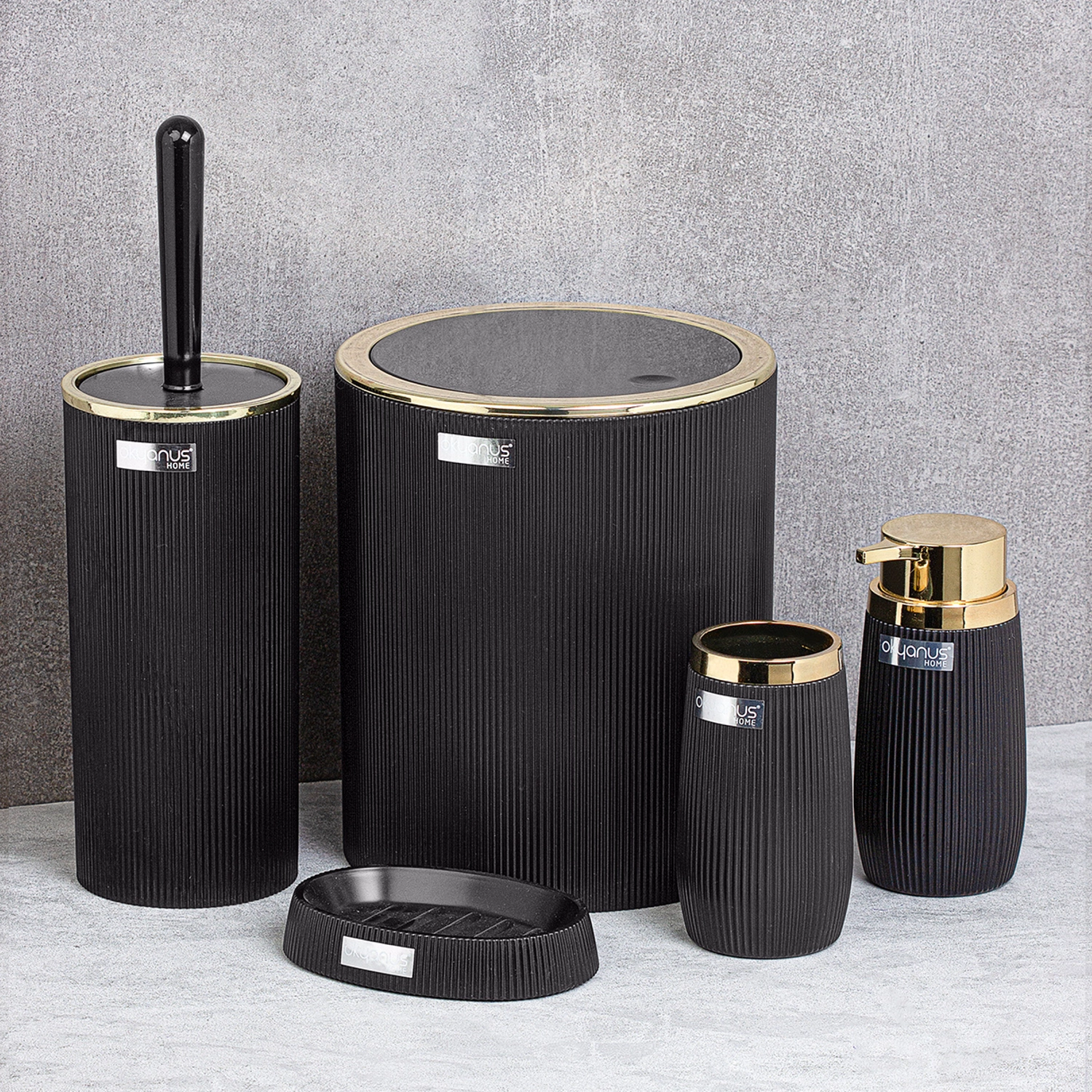 Tato designová sada kombinuje moderní černý povrch se zlatými akcenty, které vašemu interiéru dodají prémiový nádech. Díky kvalitnímu plastovému provedení je každý prvek lehce omyvatelný a vhodný pro každodenní používání.
