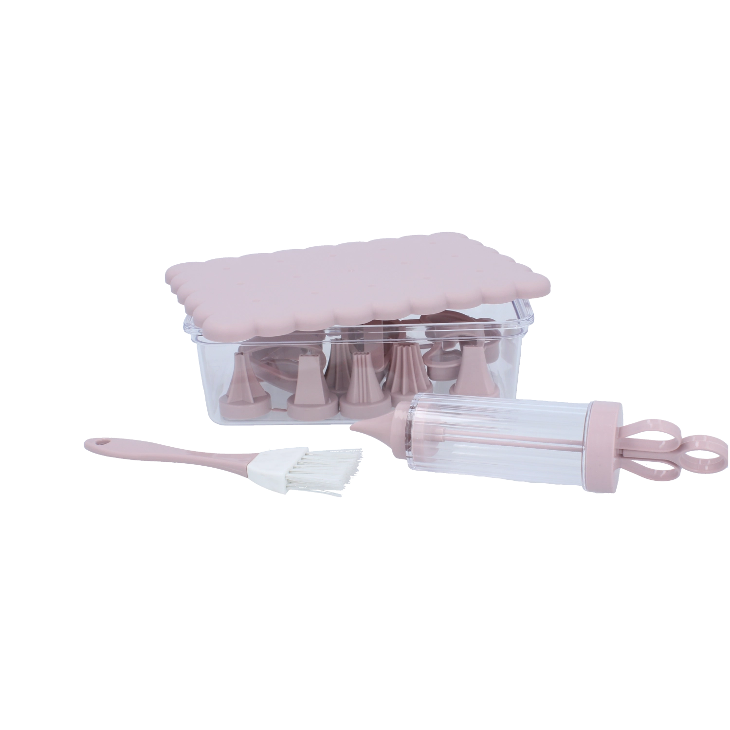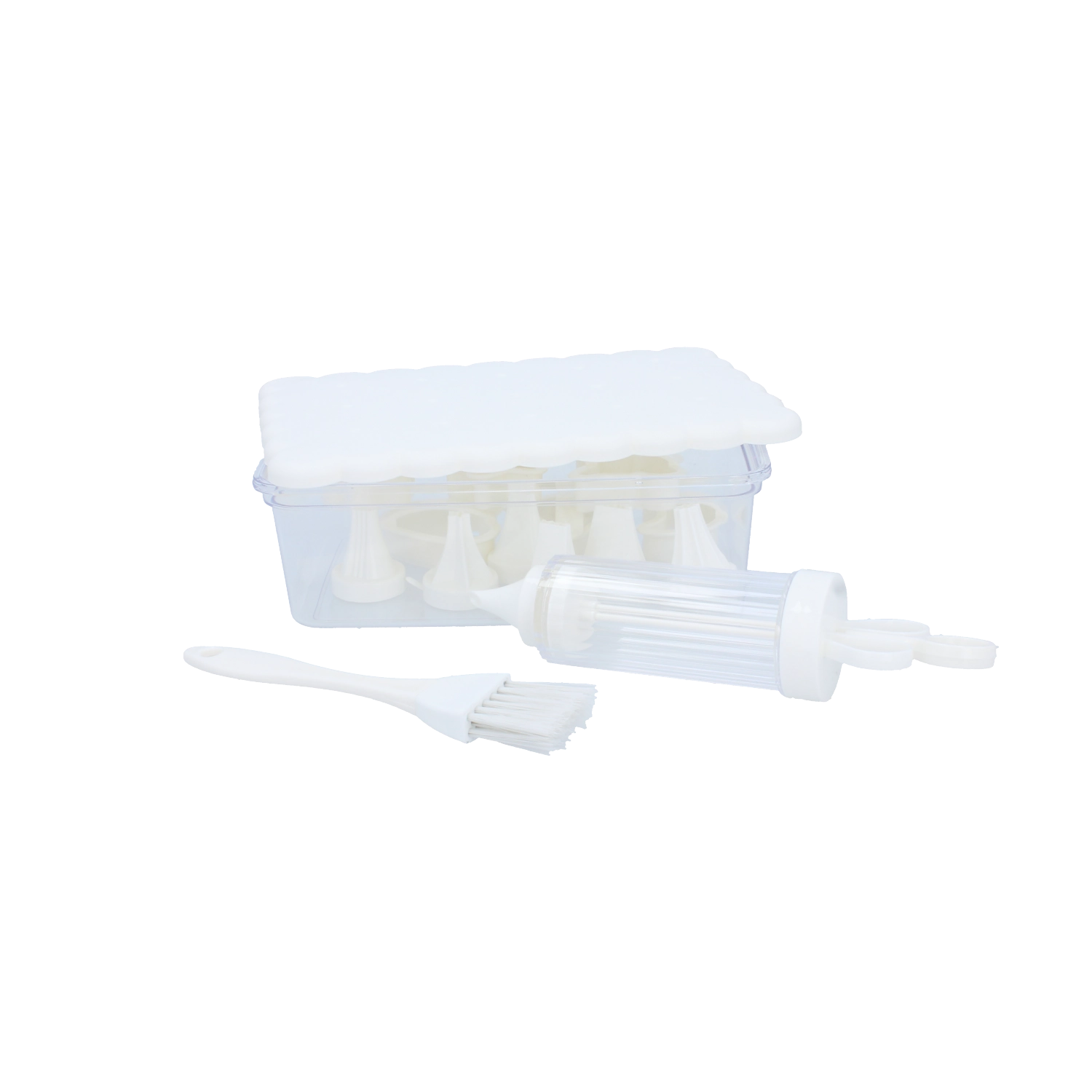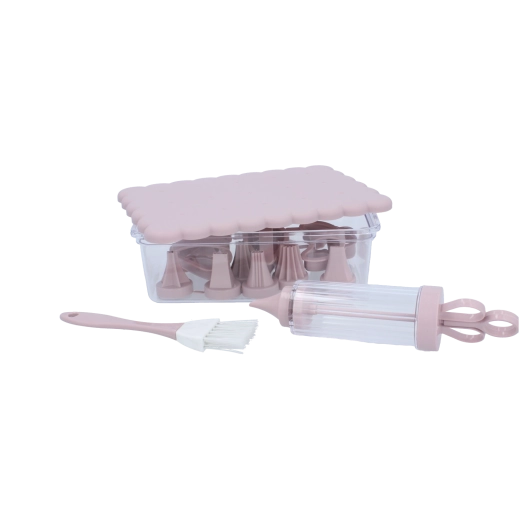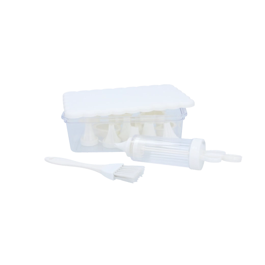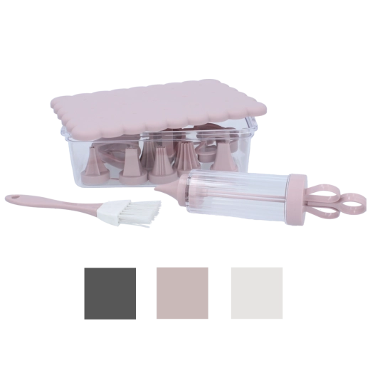 Kompletní cukrářská sada pro domácí pečení a kreativní zdobení. Obsahuje 16 praktických dílů, včetně vykrajovátek na sušenky, zdobicí stříkačky s vyměnitelnými koncovkami, štětečku a uzavíratelného dózy pro snadné skladování. Ideální pro začátečníky i nadšené pekaře, kteří chtějí vytvářet precizní dekorace a krásně tvarované cukroví.