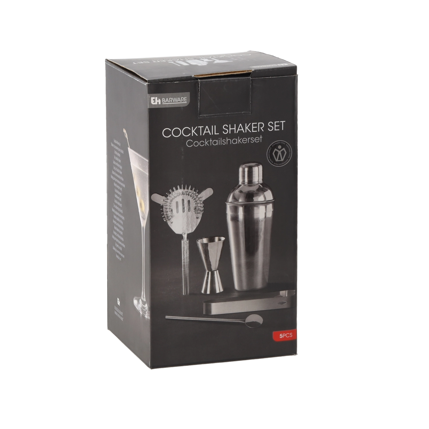 Kompletní barový set pro domácí i profesionální míchání drinků. Obsahuje 5 klíčových nástrojů z nerezové oceli pro snadné a hygienické použití: shaker 500 ml, sítko, míchací lžíci, dvojitou odměrku a kleště na led. Díky odolnému provedení, elegantnímu designu a možnosti mytí v myčce připravíte koktejly rychle, čistě a s profesionálním výsledkem.