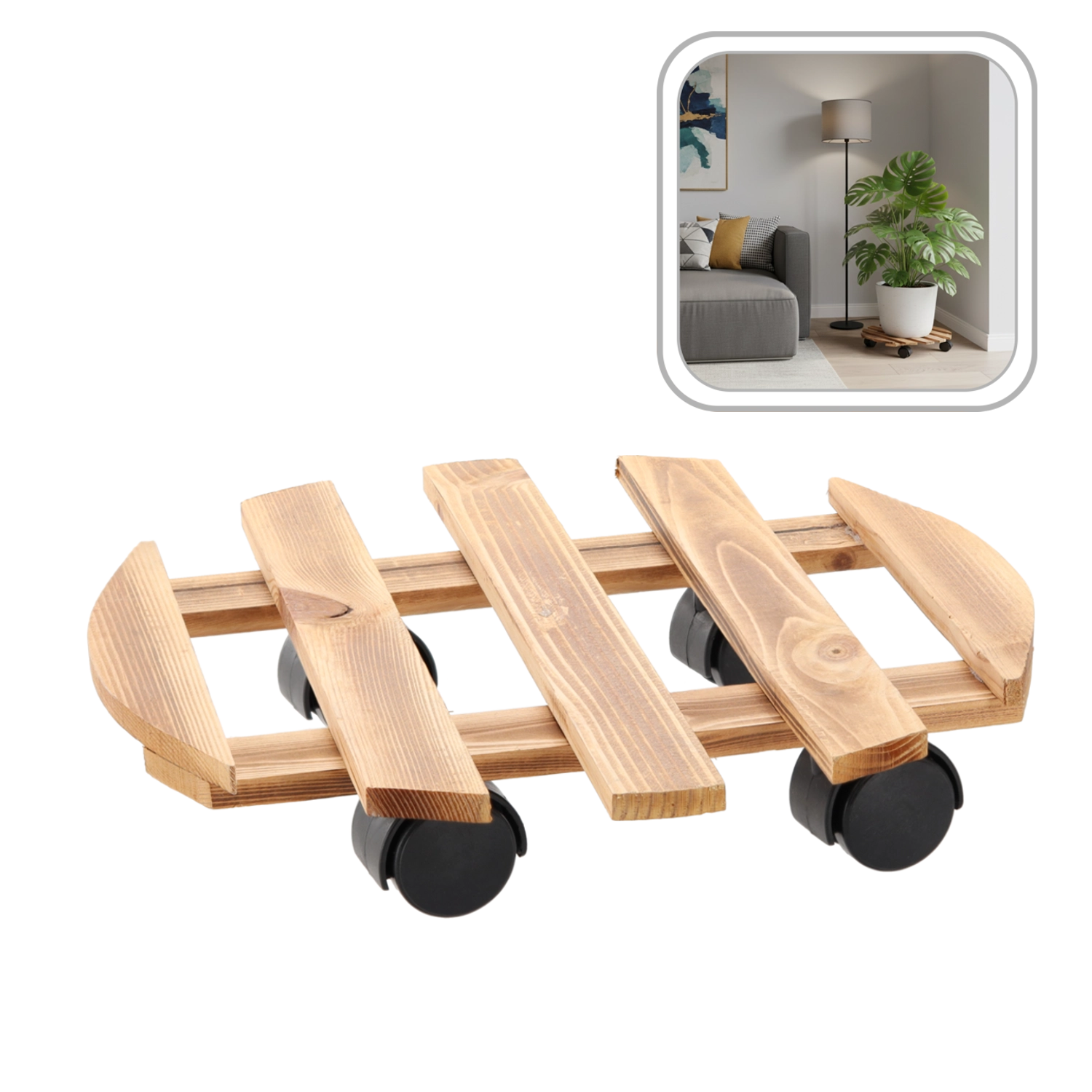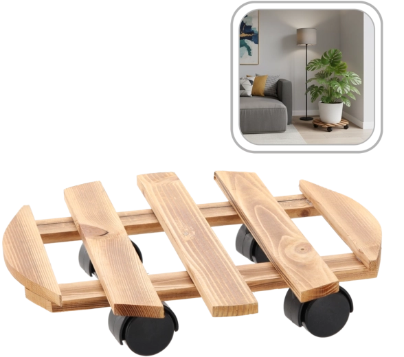 Praktický dřevěný podstavec pod květináč se čtyřmi kolečky pro snadné přesouvání rostlin bez poškození podlahy. Vhodný pro interiér, ale skvěle poslouží i na balkoně či terase. Maximální nosnost 40 kg, průměr 36 cm.