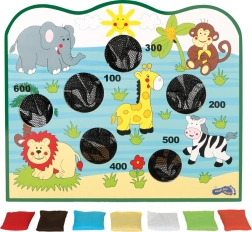 Hrací deska s barevnými ilustracemi zvířat a barevné pytlíčky dělají hru atraktivní a zábavnou pro děti.