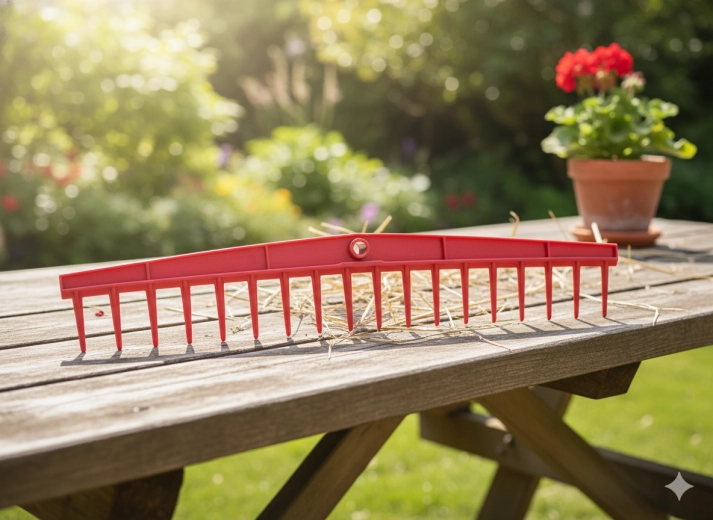 Rovná lišta s 16 zuby zajišťuje účinné shrabování listí a přesné srovnání půdy bez námahy.