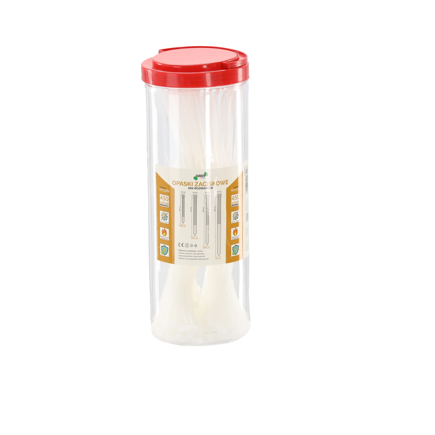 Praktická tuba obsahuje celkem 450 ks nylonových stahovacích pásků v různých velikostech pro univerzální použití v domácnosti, dílně i průmyslu. Pásky jsou samozhášivé (UL 94 V2), mají široký teplotní rozsah a díky speciální UV odolné směsi vydrží i náročné podmínky. Odolávají olejům, mazivům, benzínu a dalším chemikáliím.
