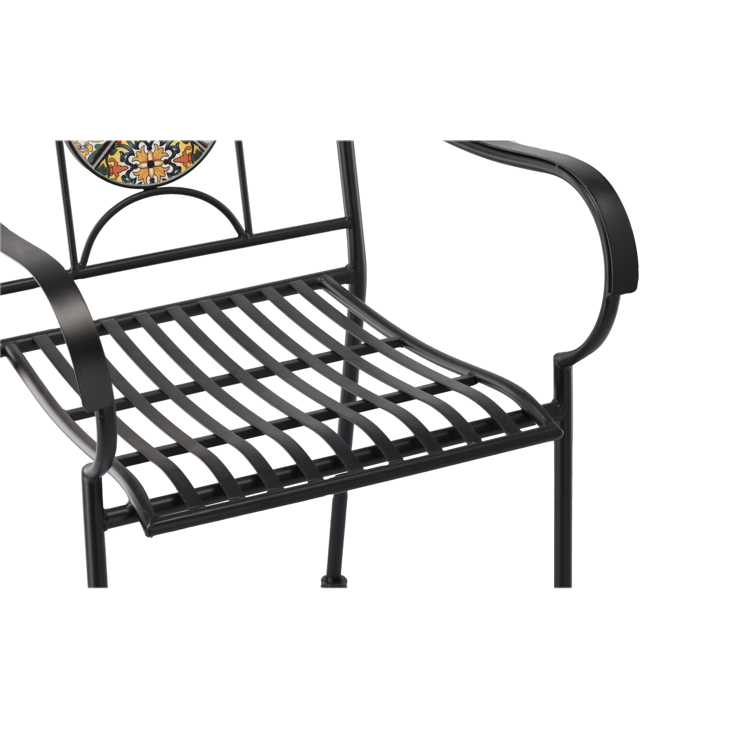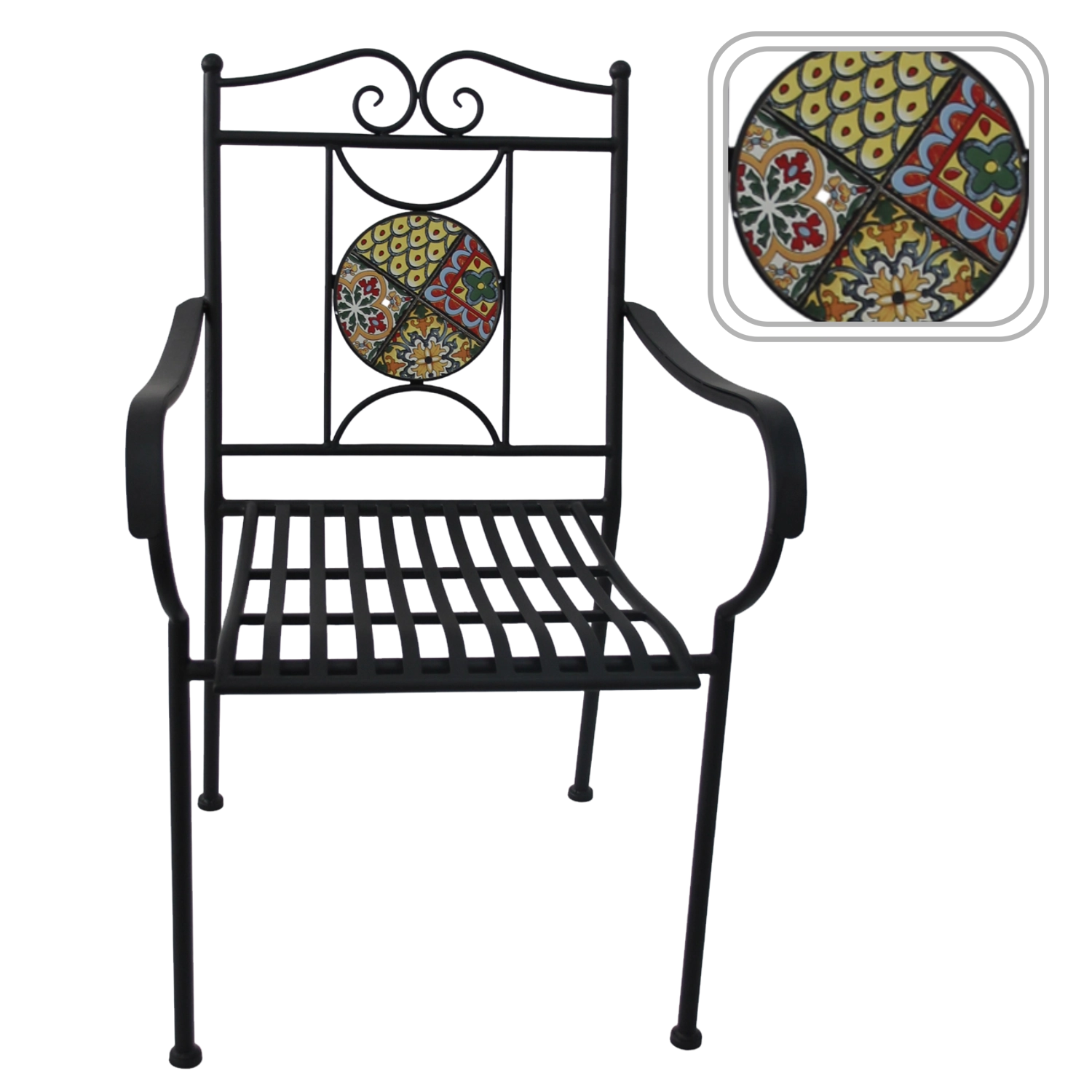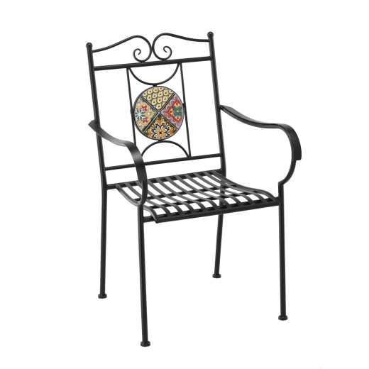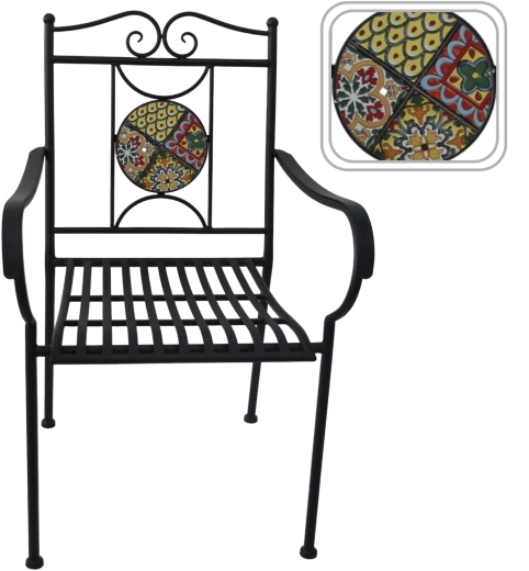 Kruhový mozaikový medailon v opěradle dodává křeslu výrazný styl a stává se ozdobou každého venkovního posezení.