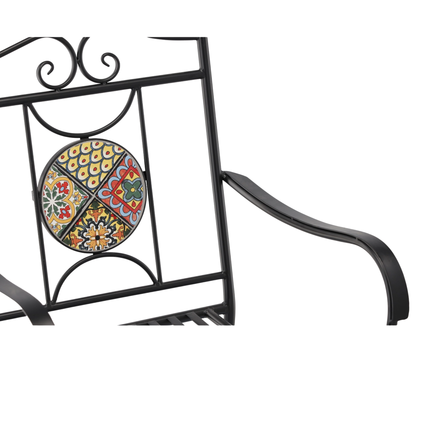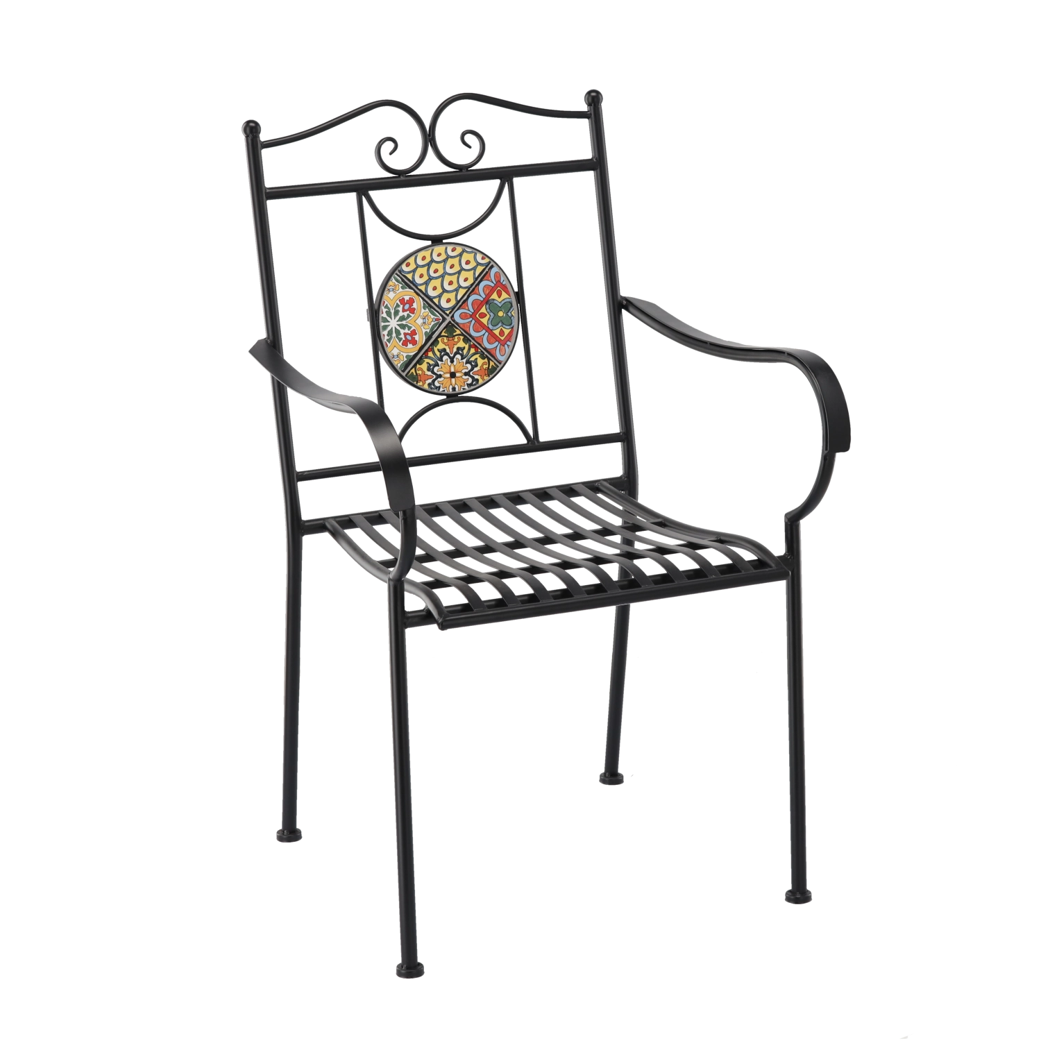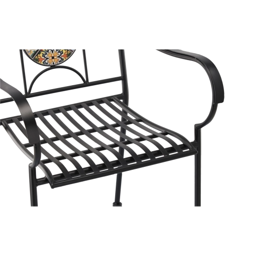 Kovové zahradní křeslo s mozaikou zaujme efektním kruhovým medailonem v opěradle a nadčasovým černým rámem. Díky pevné svařované konstrukci a laťkovému sedáku je vhodné pro celosezónní venkovní použití a snadnou údržbu – voda přirozeně odtéká.