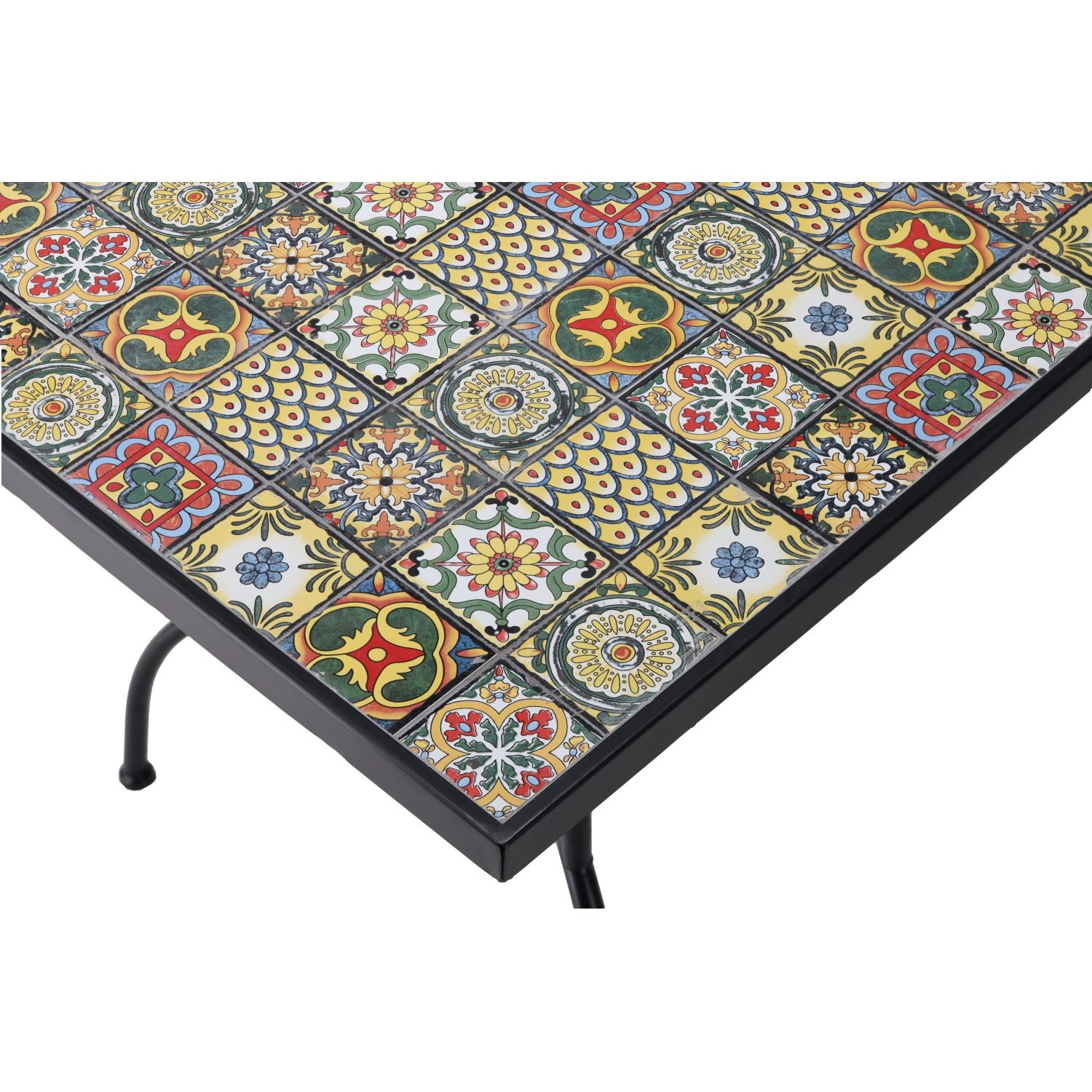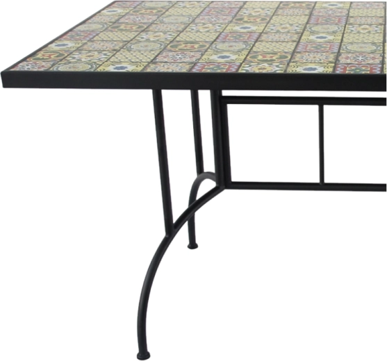 Obdélníkový mozaikový stůl o rozměrech 150 × 80 × 74 cm je ideální volbou pro venkovní stolování. Barevná mozaika dodá prostoru výrazný charakter, zatímco černý kovový rám s dekorativními prvky podtrhuje moderní a nadčasový vzhled. Díky prostorné desce pohodlně usadí několik osob a hodí se na terasy, zahrady i patia.