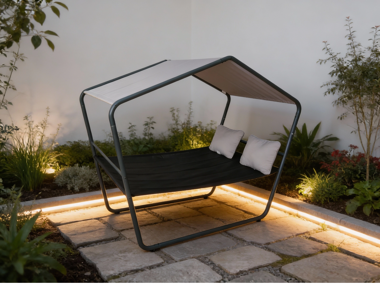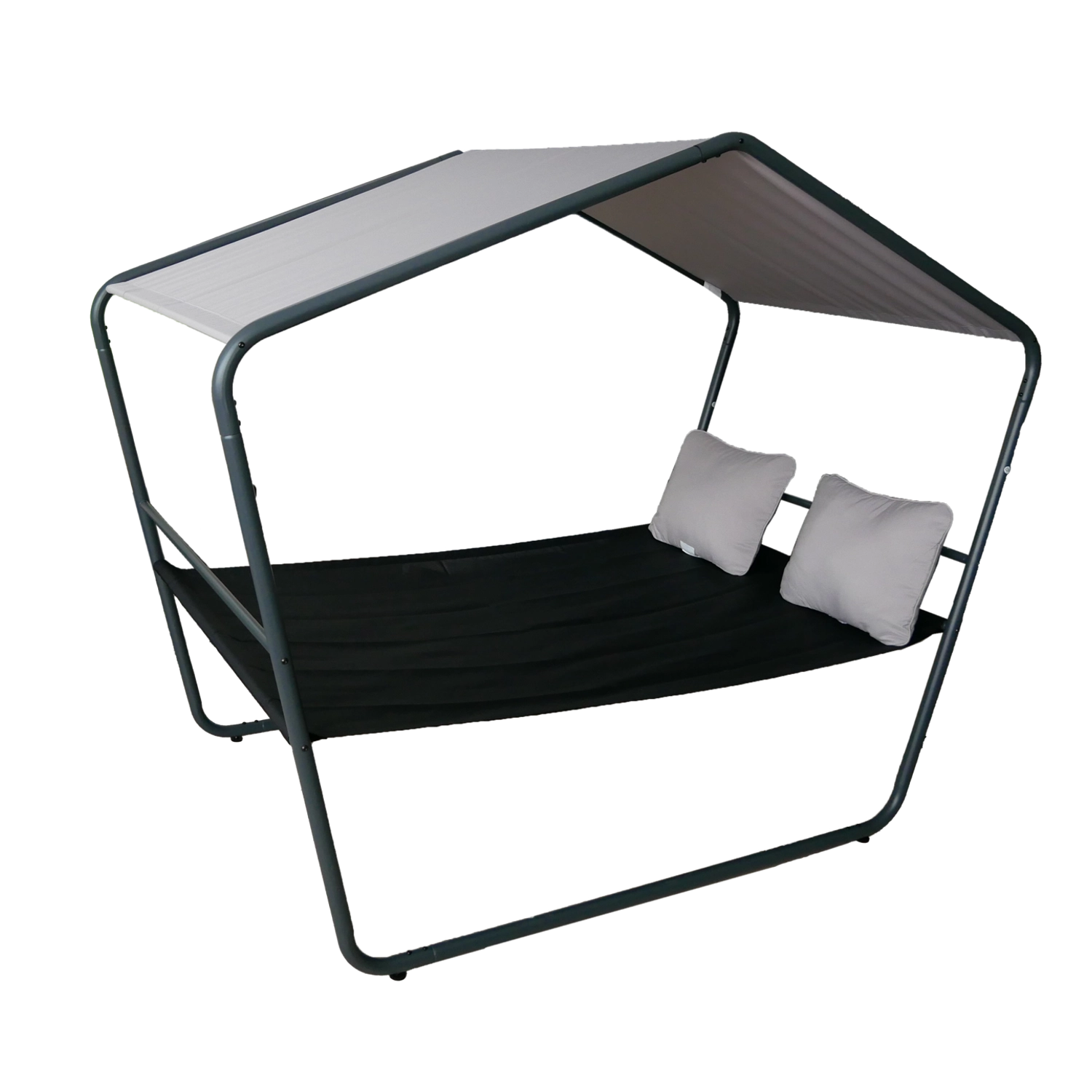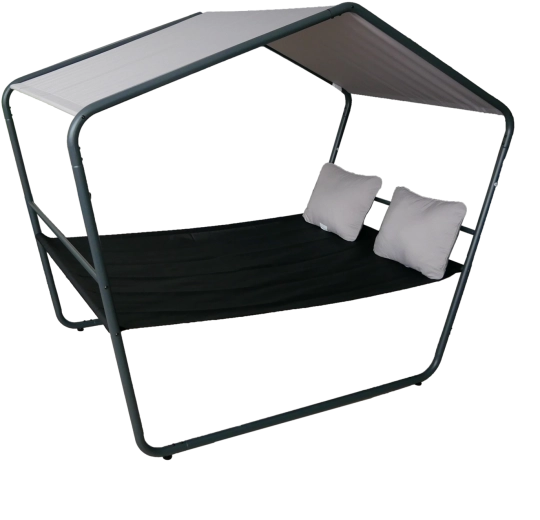 Praktická vodoodpudivá tkanina stříšky chrání před sluncem a lehkým deštěm, UV odolná ložná plocha je nenáročná na údržbu a rychle schne. Dva měkké polštáře v jemném odstínu podtrhují komfort pro čtení, odpočinek i odpolední siestu.
