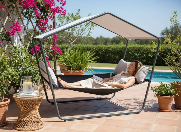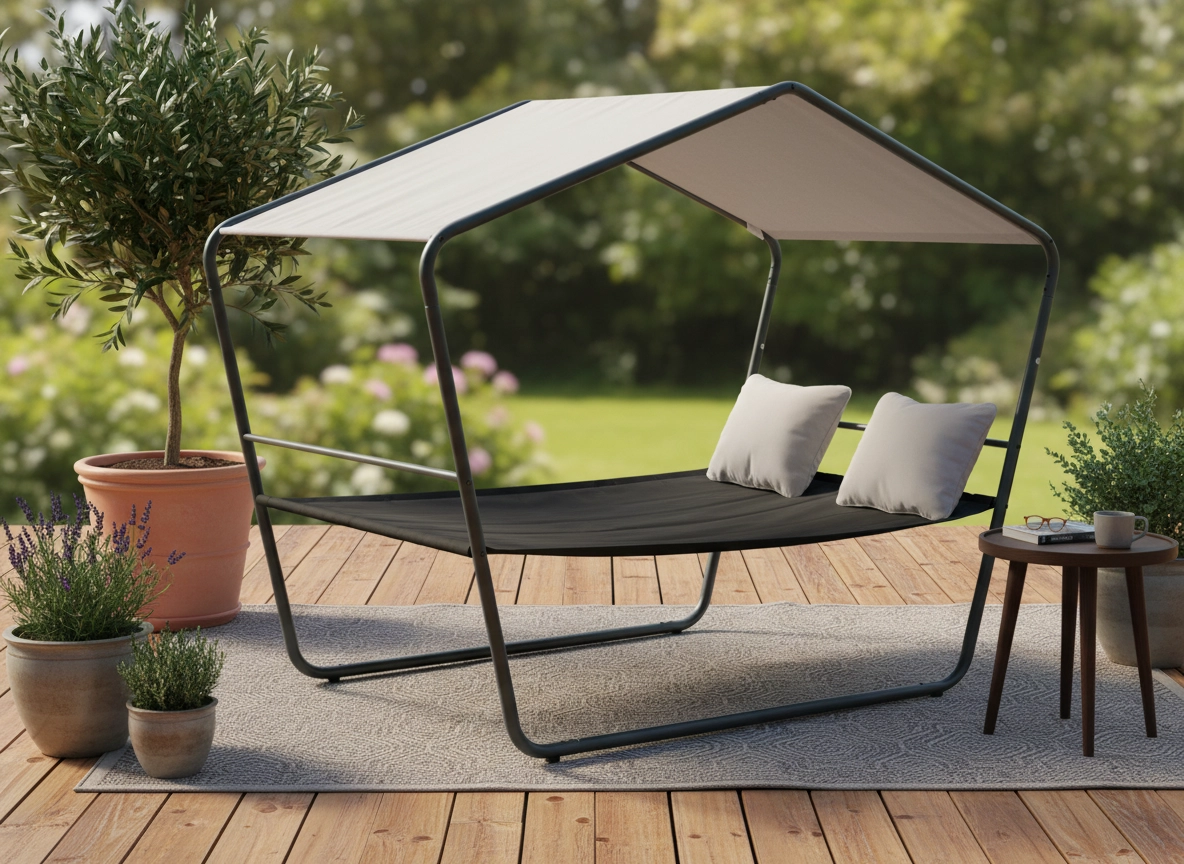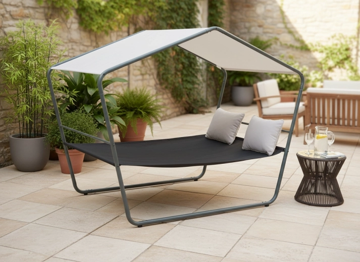 Toto dvojité zahradní lehátko se stříškou promění vaši terasu v oázu klidu. Stabilní kovová konstrukce, prodyšná síťovina Textilene a nastíněná střecha zajistí pohodlí během horkých dnů i po dešti. Díky nadčasovému vzhledu zapadne do moderních i přírodních exteriérů.
