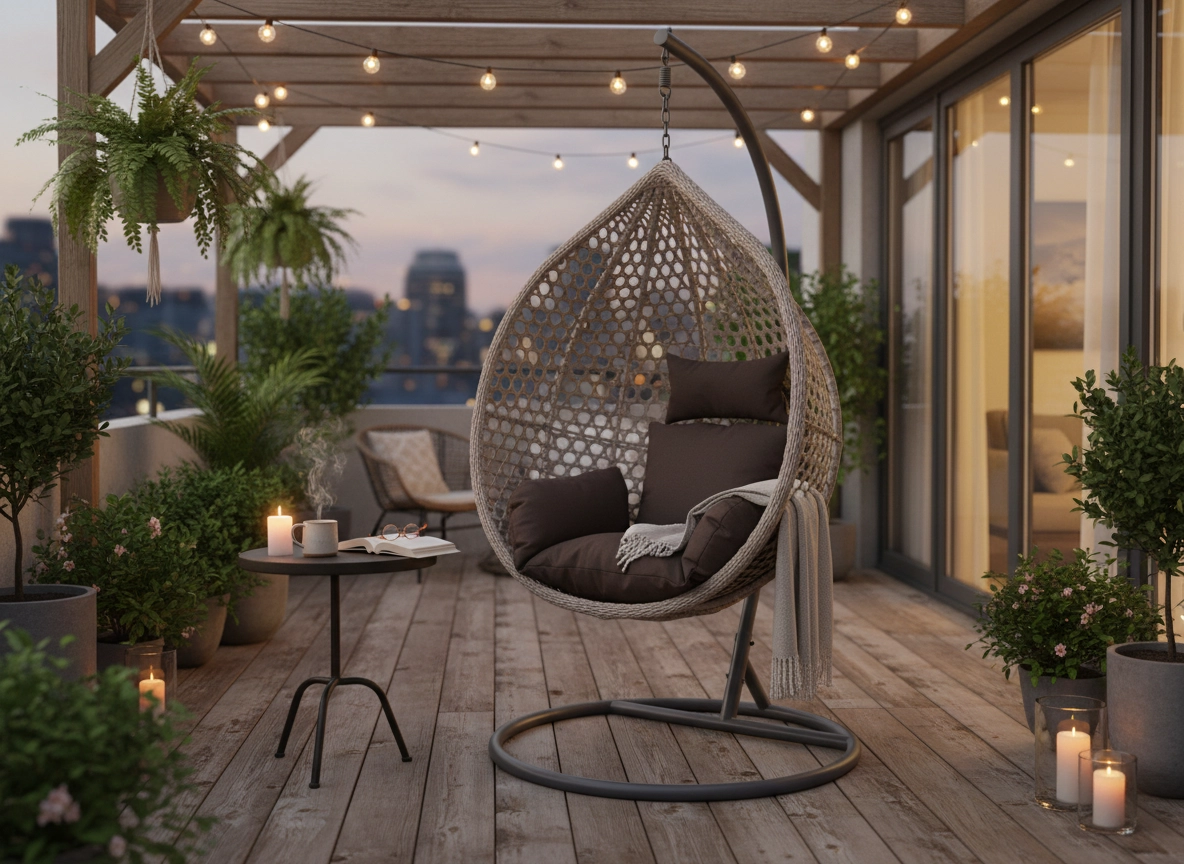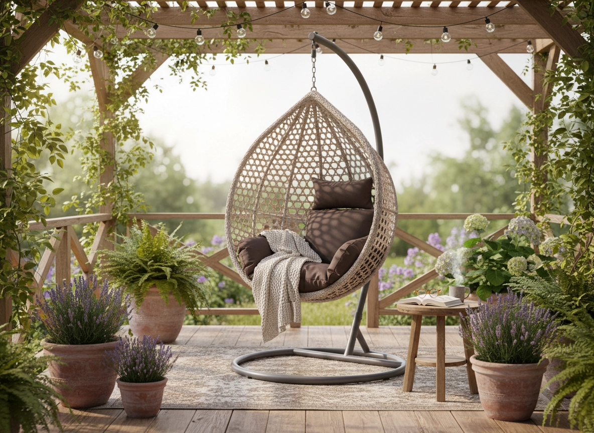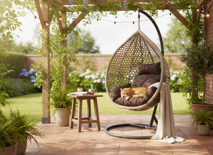 Stojan s kruhovou základnou a křivkovým ramenem poskytuje pevnou oporu pro jemné houpání. Měkké polstrování v sedáku i opěrce podporuje přirozené držení těla a zvyšuje pohodlí při čtení, práci na notebooku nebo odpočinku.