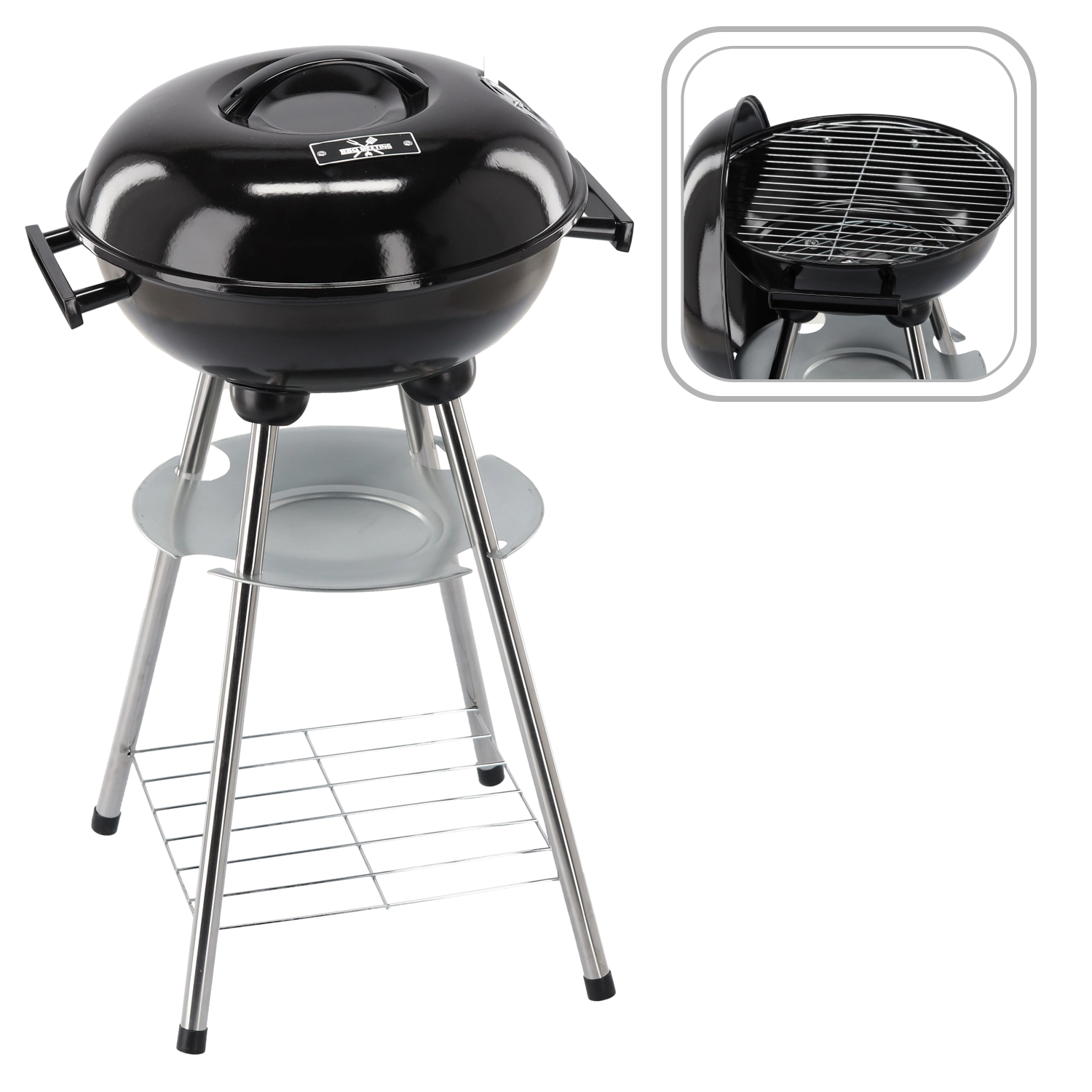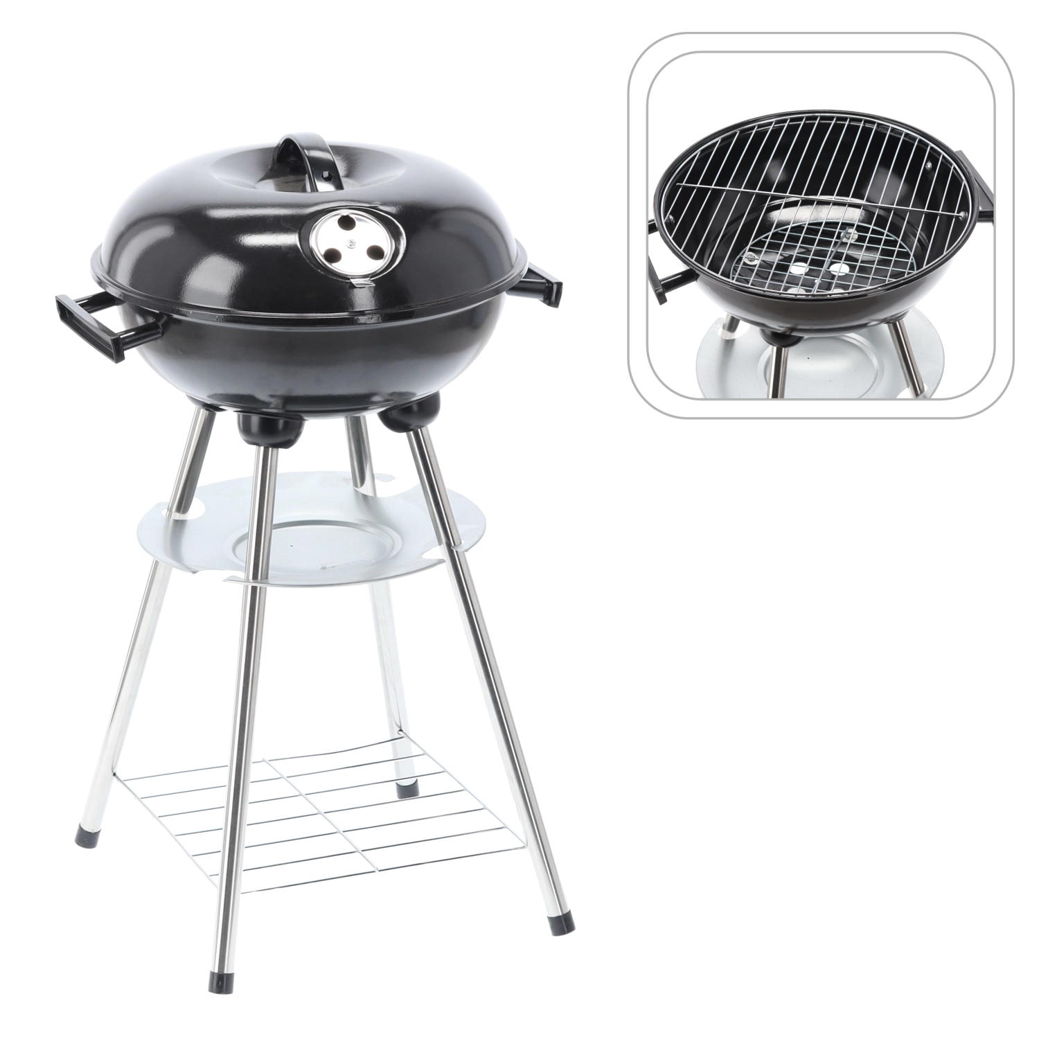 Víko s větracími otvory pomáhá udržet stabilní žár a šířit teplo konvekcí, což vede k rovnoměrnému propečení. Dolní odkládací polička udrží příslušenství po ruce a zpevní celou konstrukci.