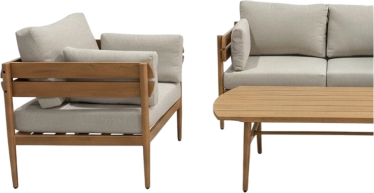 Elegantní set pro venkovní relax nabízí 2 křesla, dvoumístnou pohovku a konferenční stolek s lamelovou deskou. Lehký, ale stabilní hliníkový rám odolá povětrnosti, zatímco béžové podušky o tloušťce 12 cm zajistí celodenní pohodlí. Kompaktní rozměry se skvěle hodí do menších i středně velkých prostor.