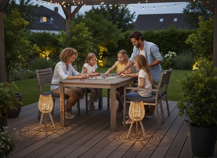 Díky bezdrátovému provozu jej snadno umístíte kamkoli – na dřevěnou terasu, zahradní chodník i balkon. Pletený ratanový vzhled dodá prostoru moderní boho nádech a dřevěné nohy zajistí stabilitu i elegantní akcent.