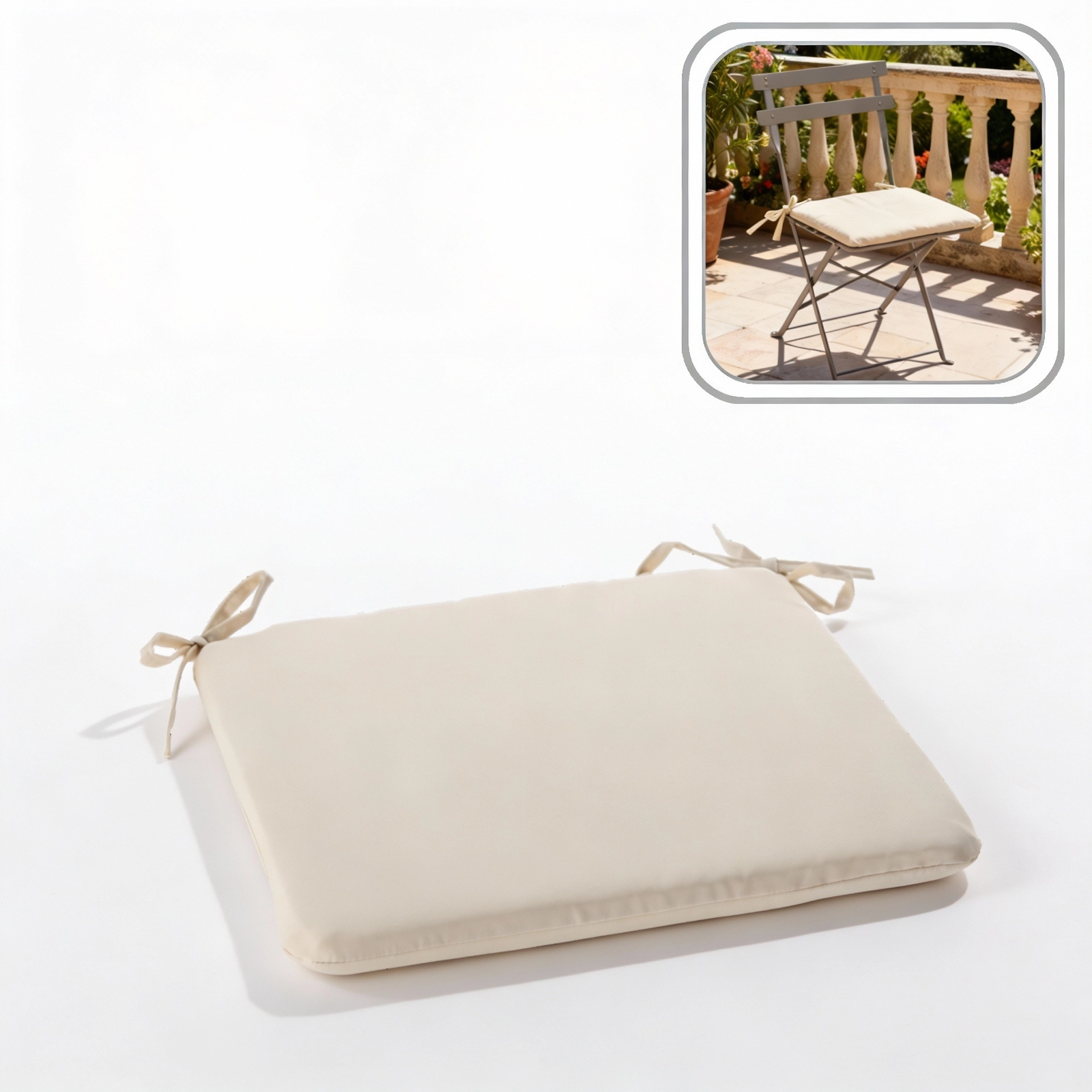 Dvě šňůrky v rozích umožňují snadné a pevné přivázání, takže sedák zůstane na místě.