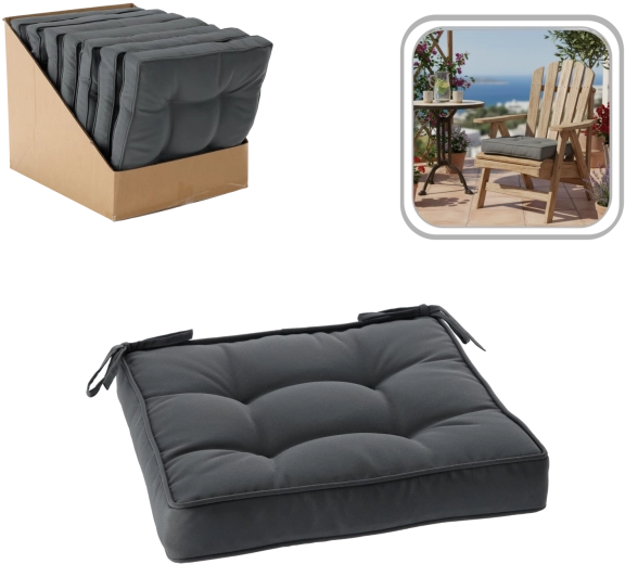 Odolný potah ze 100% polyesteru je příjemný na dotek a snese běžné zacházení i drobná potřísnění. Silná výplň z polyesterového vlákna dodává pohodlí a čtyřbodové prošívání udržuje náplň na místě. Díky dvěma upevňovacím šňůrkám sedák bezpečně drží na většině židlí.