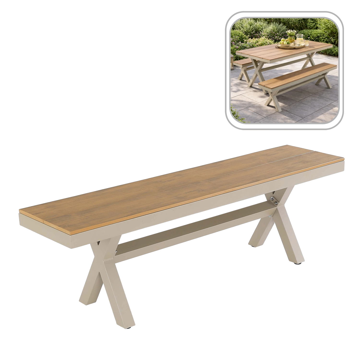 Díky čistým liniím se hodí do moderních i klasických exteriérů – na zahradu, terasu, balkon i do komerčních prostor. Lze ji doplnit o ladící zahradní stůl (klasický 150 × 90 cm nebo rozkládací 180/240 × 90 cm) a vytvořit tak funkční a harmonický set. Stůl není součástí balení – prodává se samostatně.