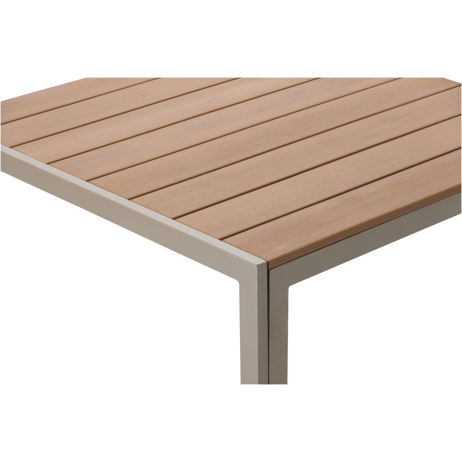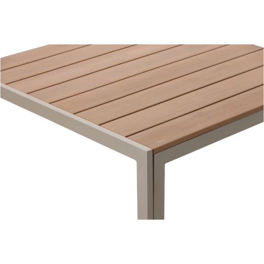 Moderní hliníkový stůl s deskou z dřevoplastových lamel nabízí nadčasový vzhled přírodního dřeva bez nutnosti náročné údržby. Povrch je práškově lakovaný, takže skvěle odolává vlhkosti, UV záření i korozi. Neutrální béžová barva se snadno kombinuje s různými styly nábytku a doplňků.