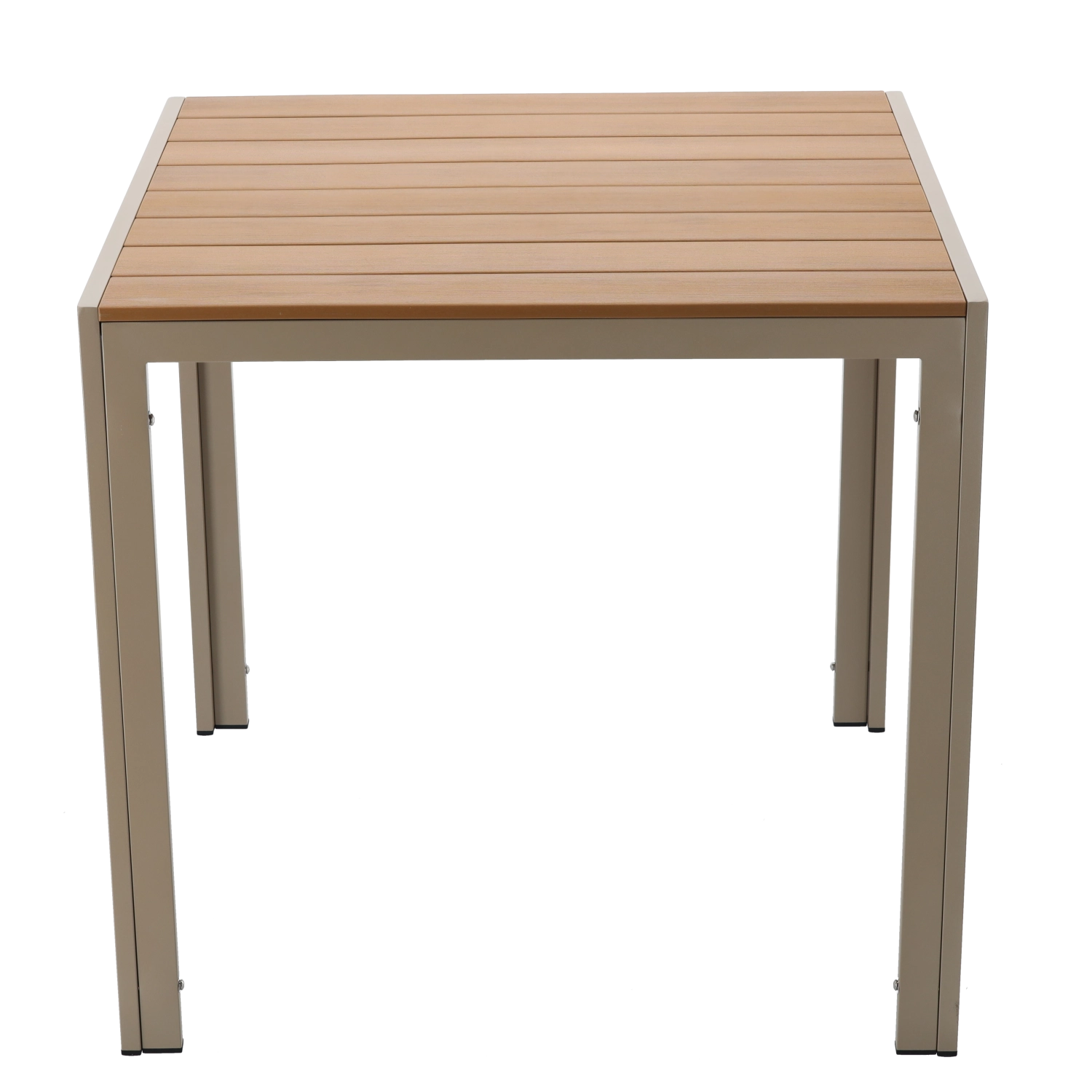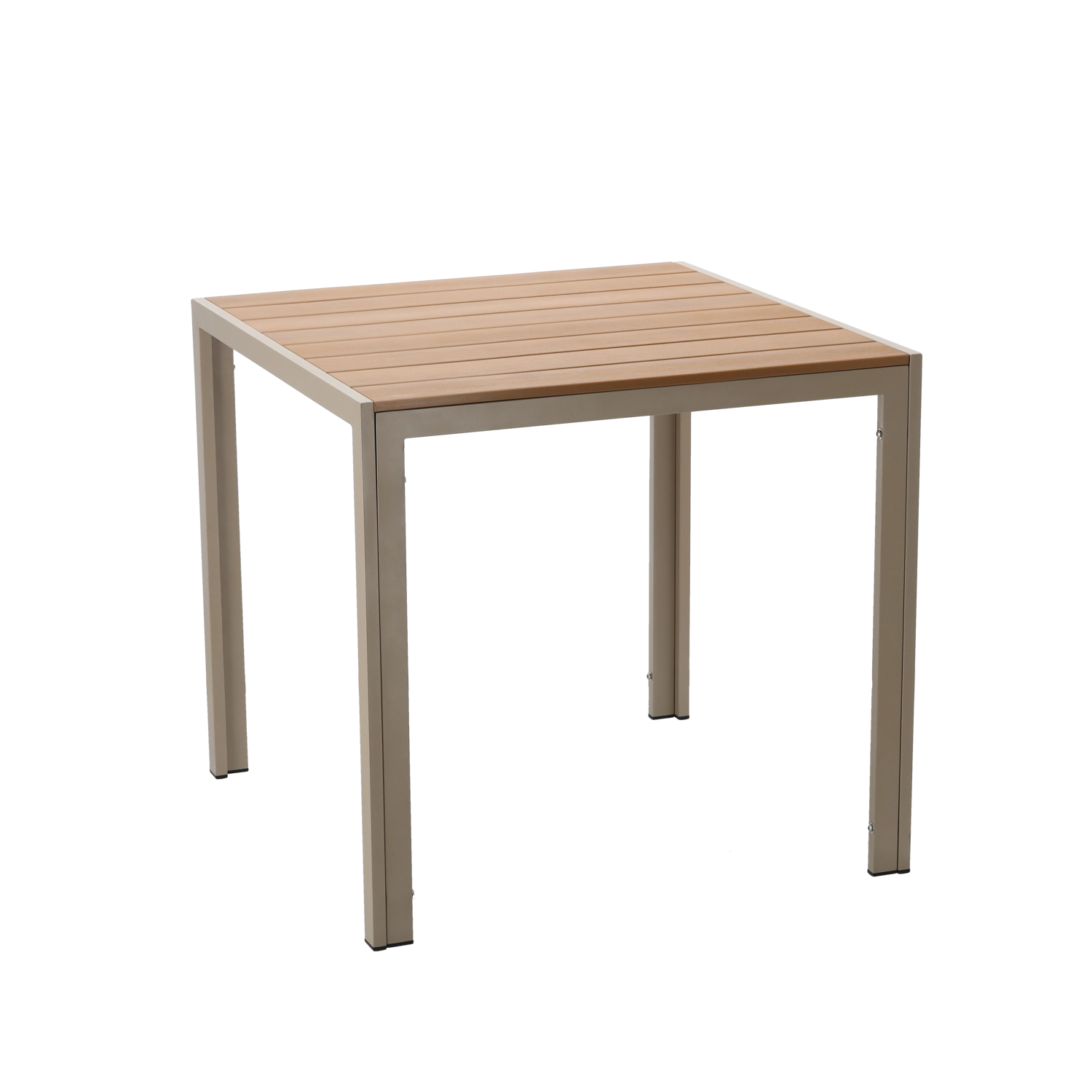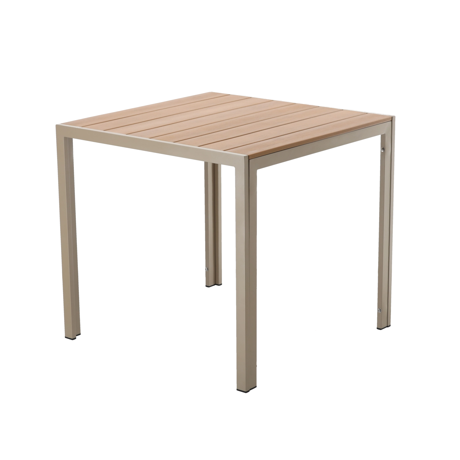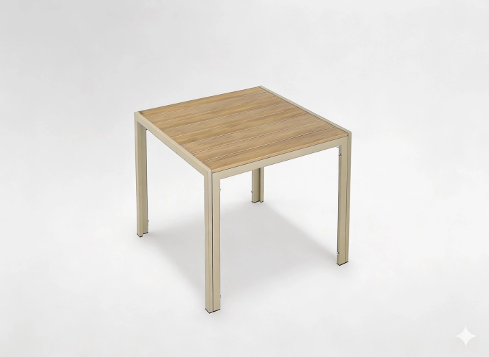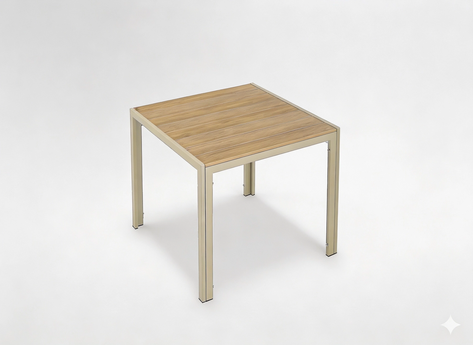 Díky čtvercovému formátu 80 × 80 cm je stůl perfektní pro menší prostory a komorní posezení. Stabilní rám z hliníku a kvalitní spojení svarů a nerezových šroubů zajišťují dlouhou životnost a pevnost při každodenním používání.