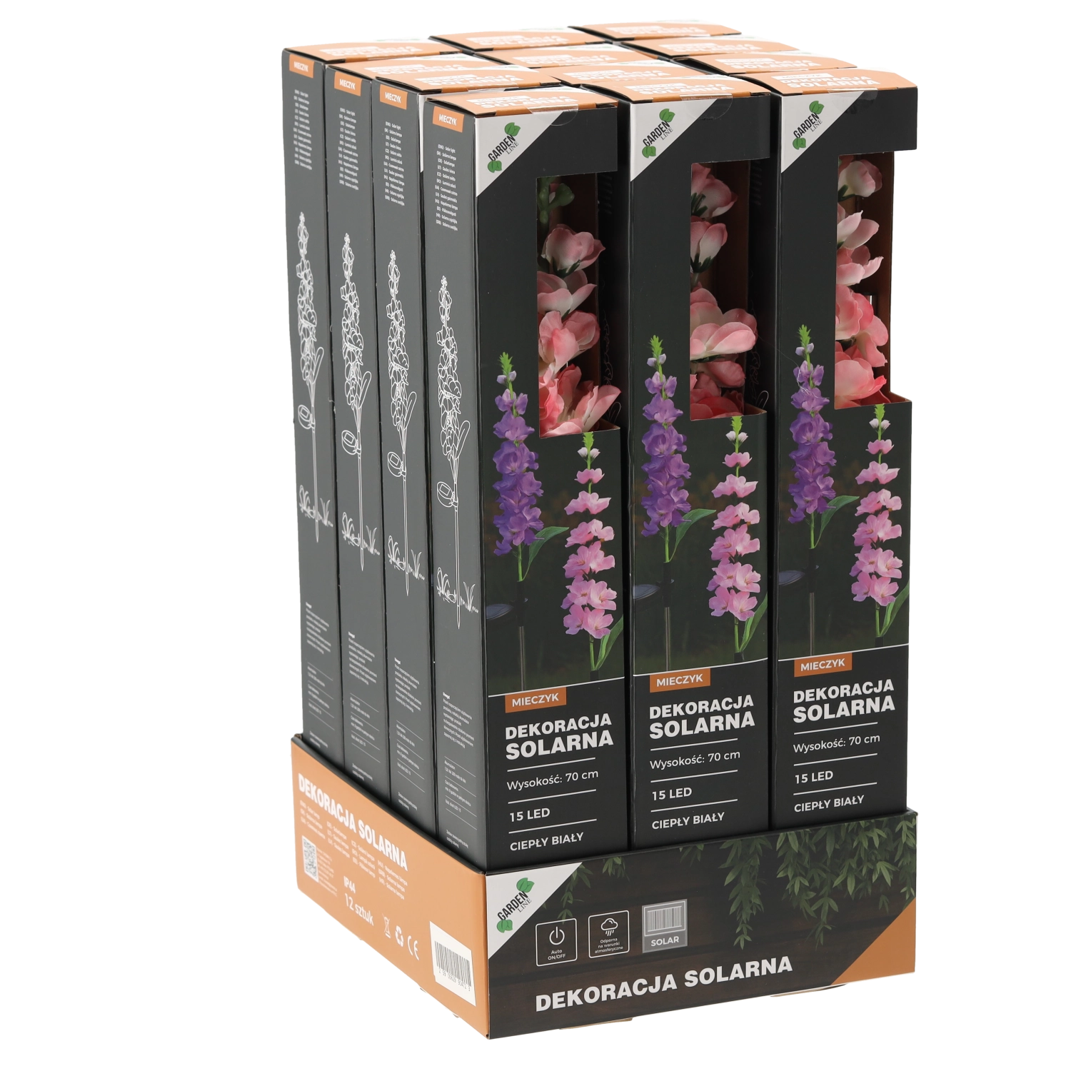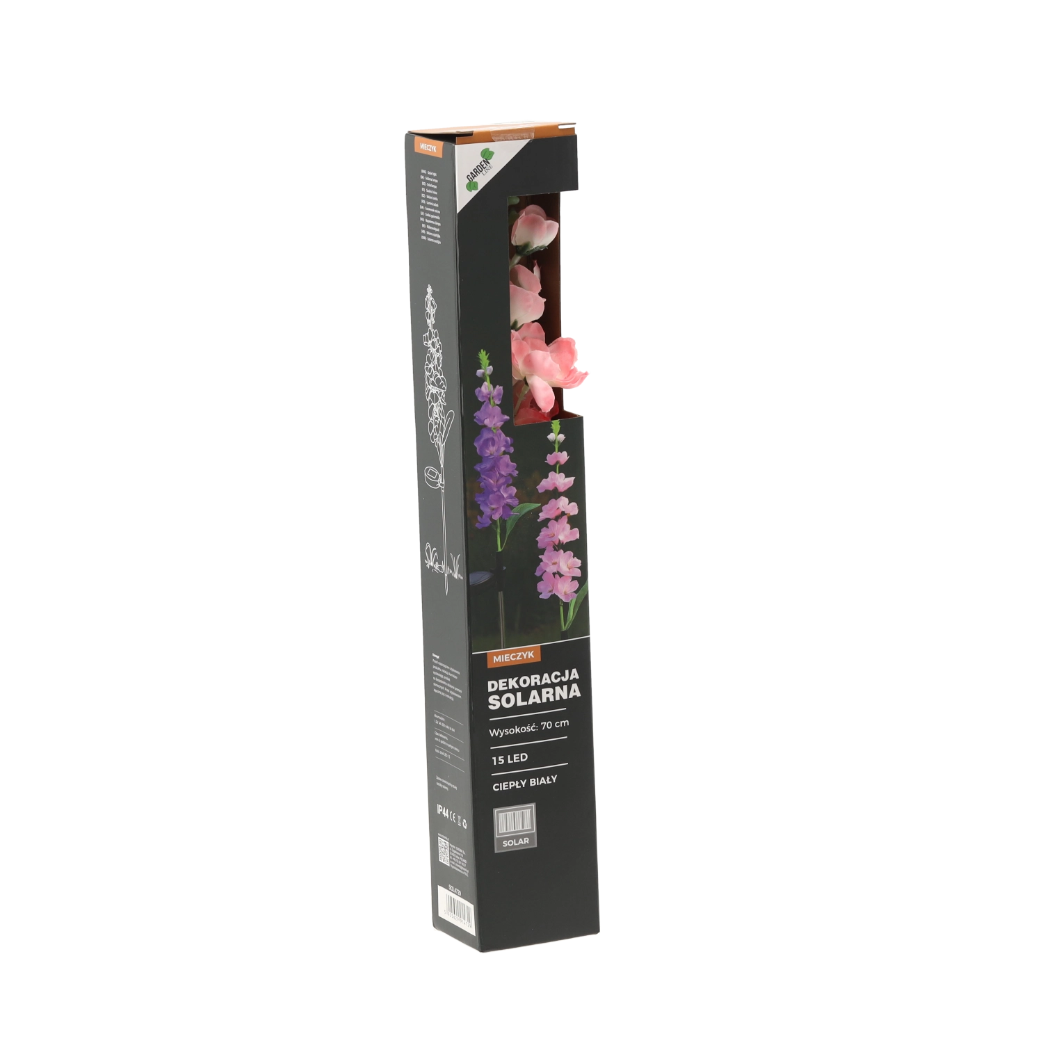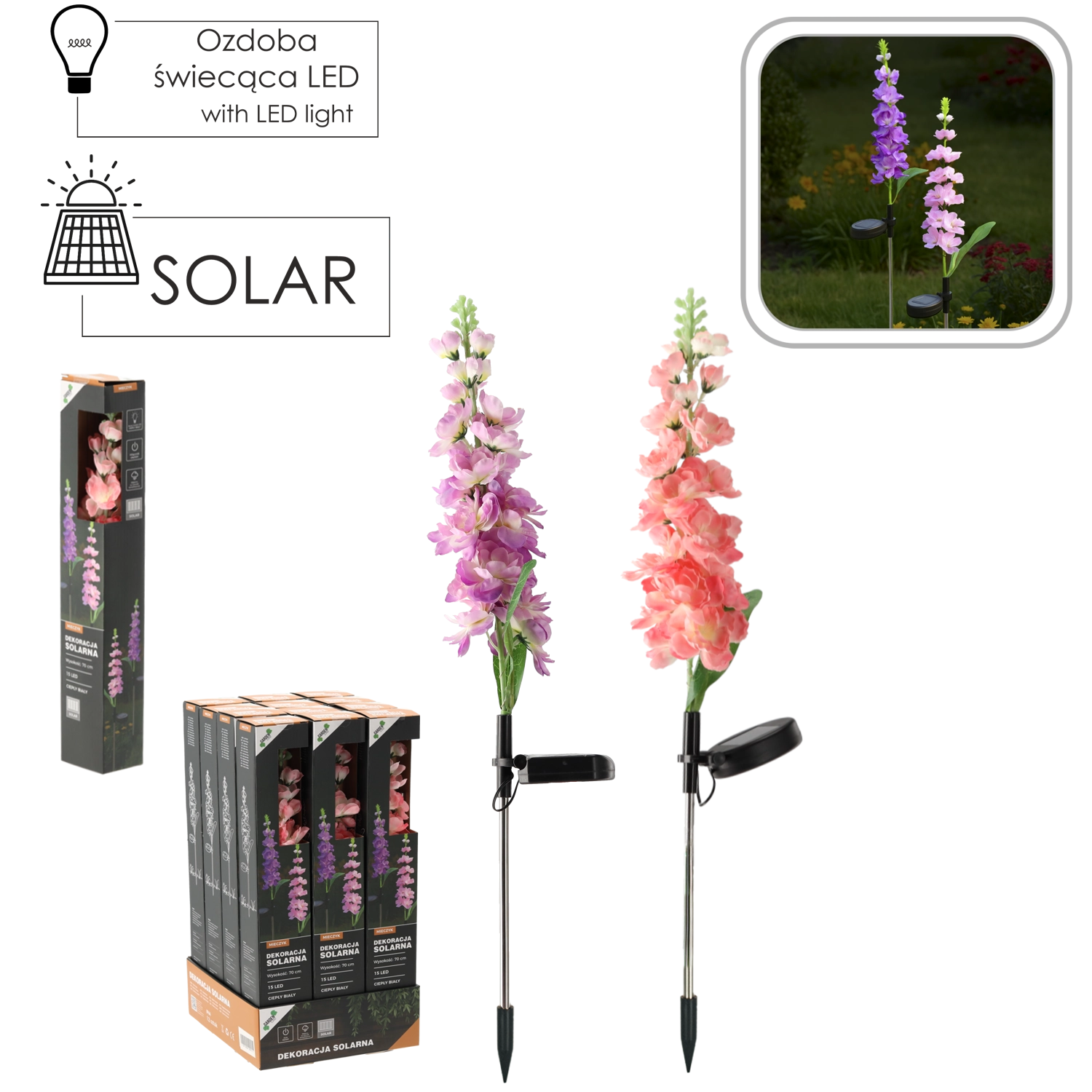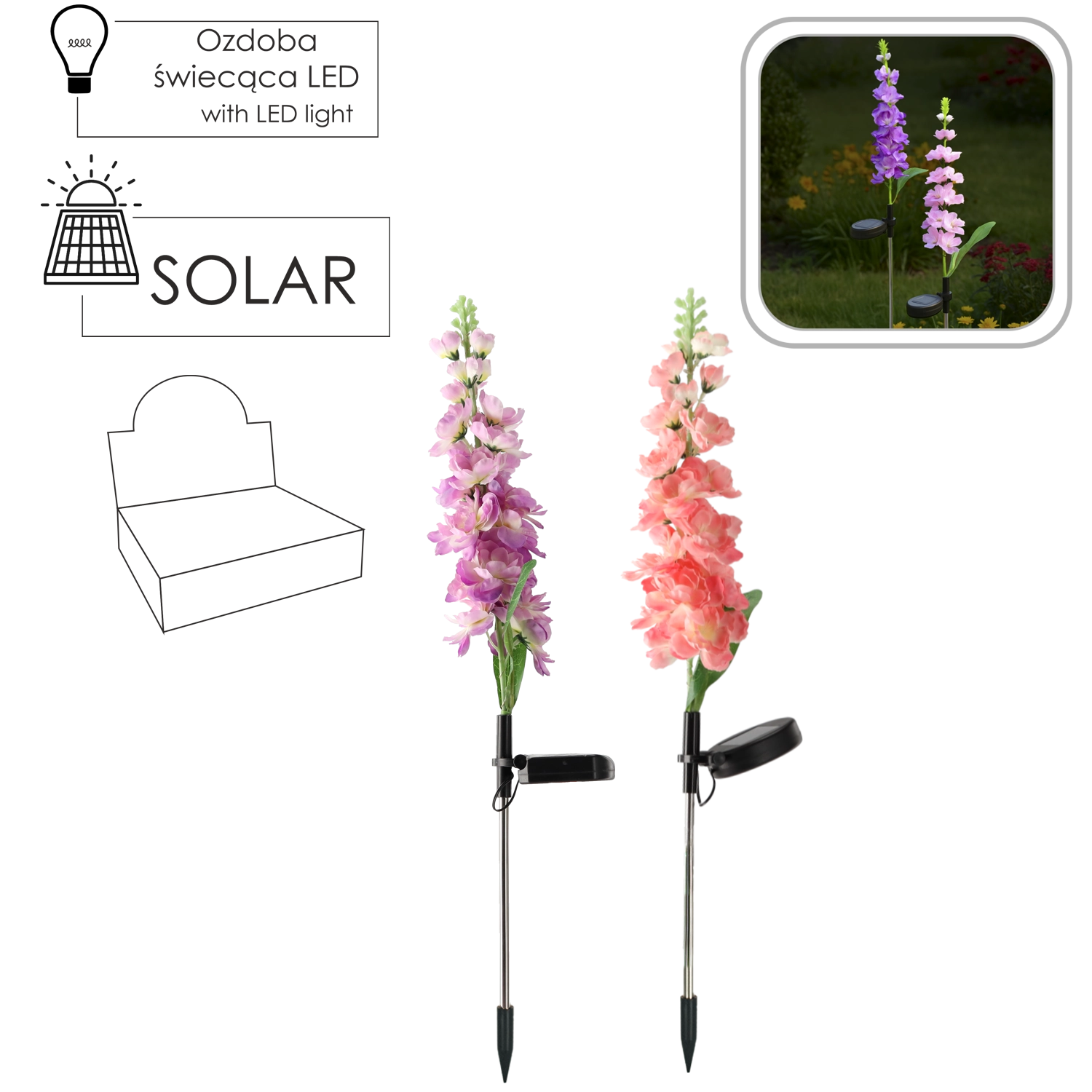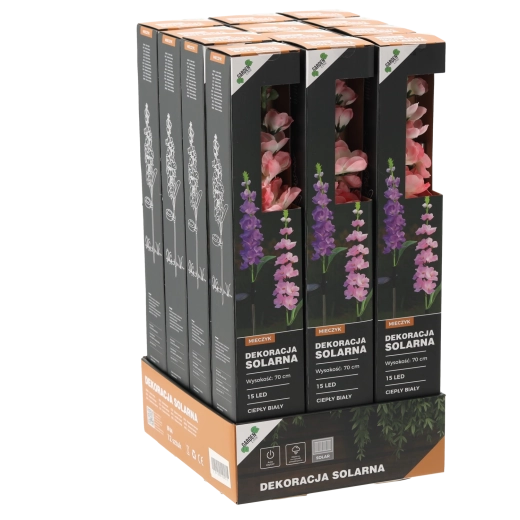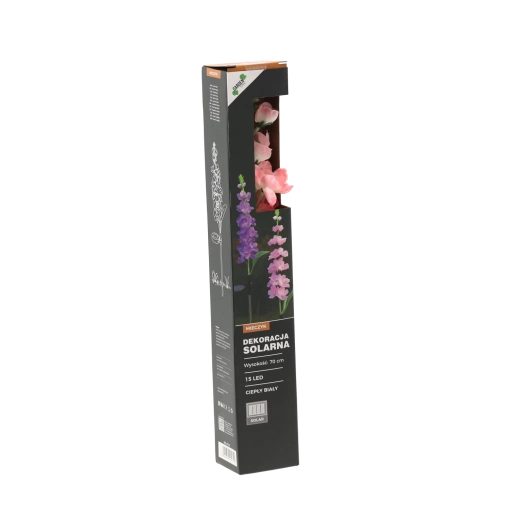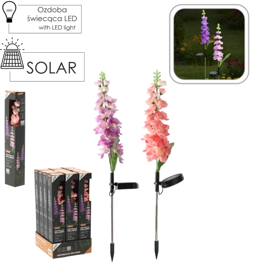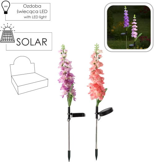 Díky krytí IP44 odolá běžným povětrnostním vlivům. Instalace je snadná – stačí zapíchnout kolík do země nebo truhlíku, zapnout a nechat na slunci. K dispozici je mix barev květu: růžová nebo fialová, který oživí každý záhon i venkovní dekor.