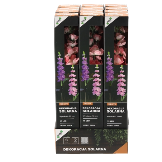 Detailně zpracovaný mečík v růžové nebo fialové barvě zdobí zahradu ve dne a po setmění ji rozzáří teplým bílým světlem 15 LED.