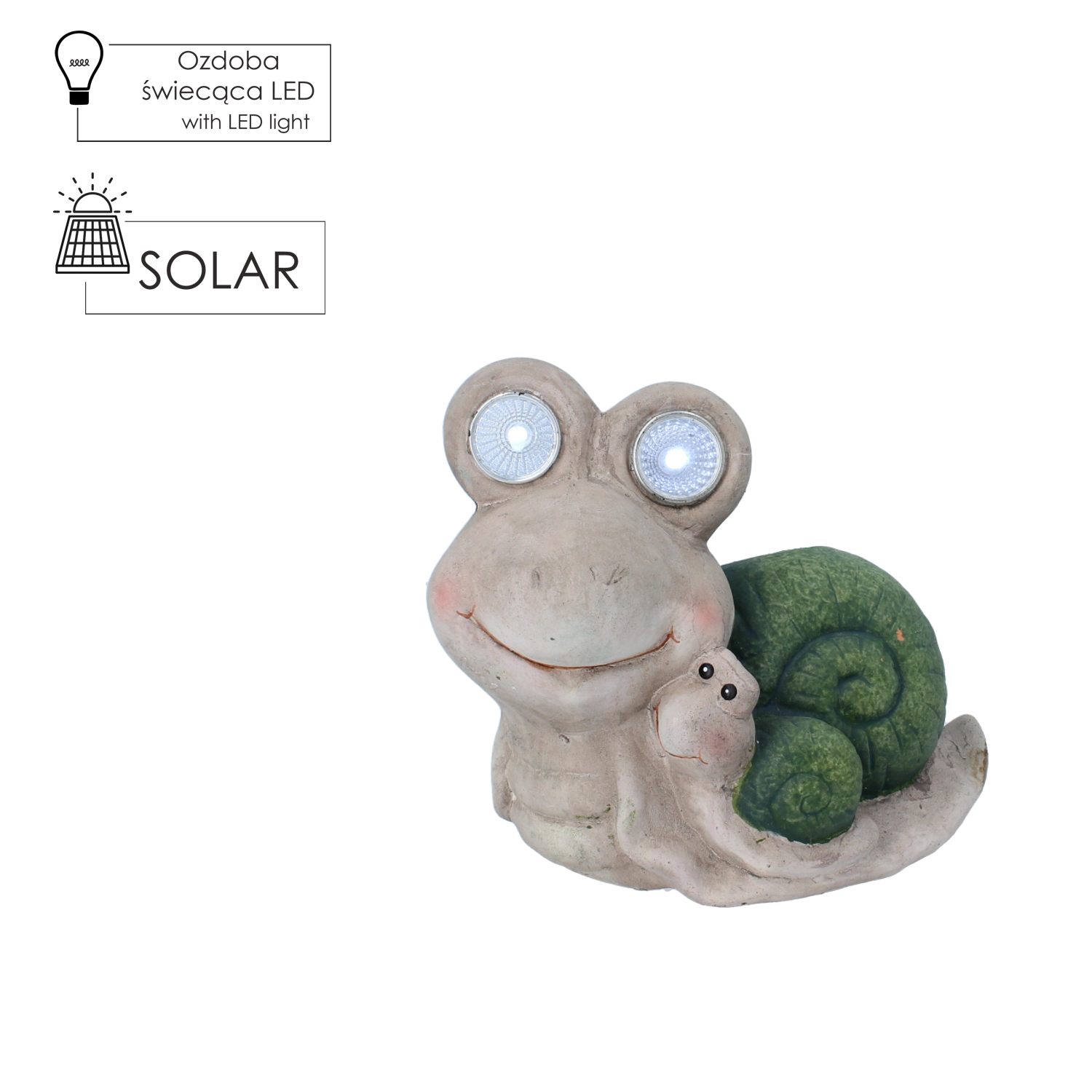 Velké oči šneka jsou vybaveny LED, které po setmění vytvoří příjemné a nenápadné světlo. Ideální jako dekorativní akcent na zahradě či balkoně.