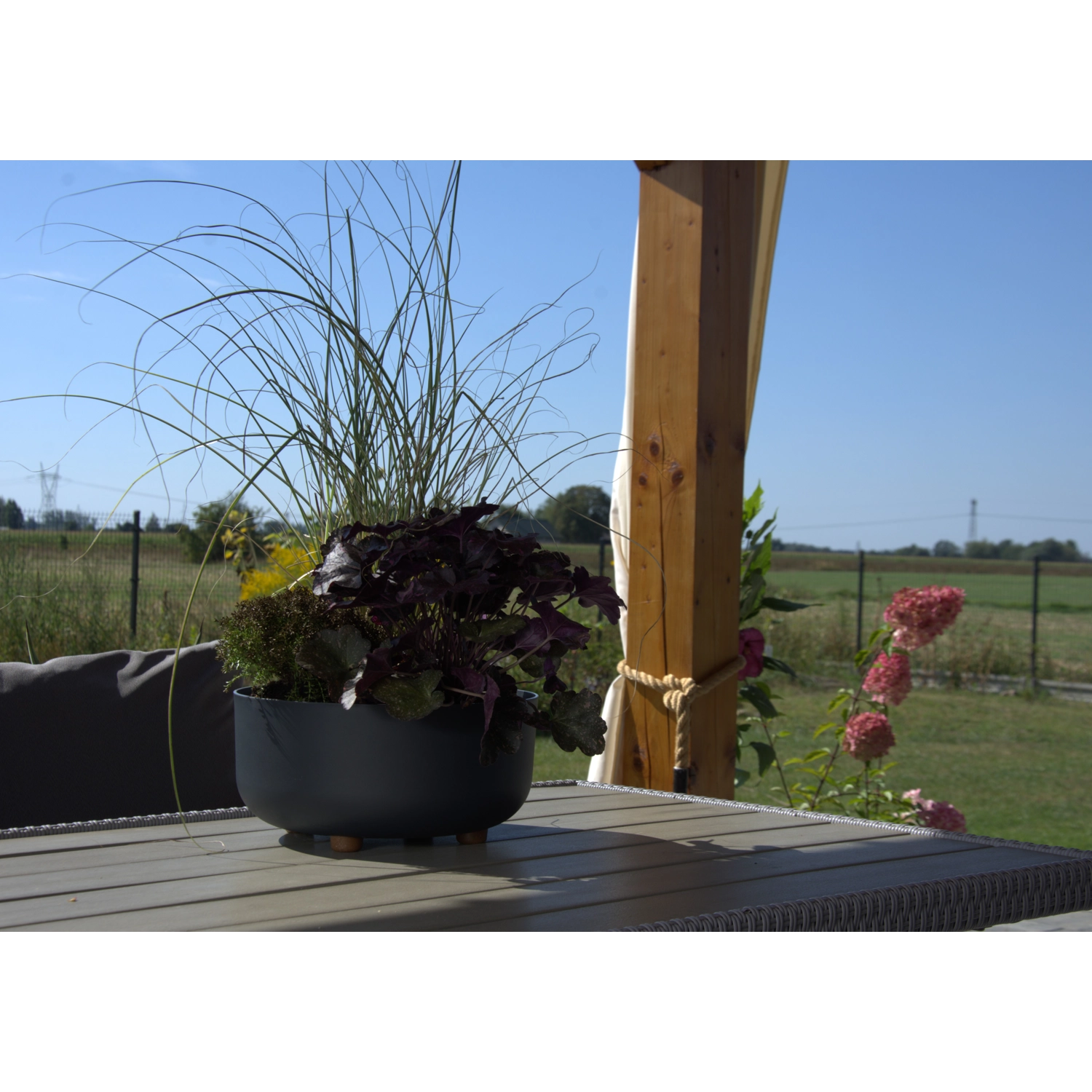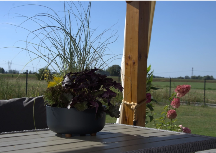 Lehká konstrukce umožňuje snadné přenášení mezi místnostmi, terasou či zimní zahradou. Nožky dodávají misce stabilitu a podporují lepší proudění vzduchu pod nádobou, což prospívá zdraví kořenů. Pro venkovní použití lze snadno vytvořit drenážní otvor, aby přebytečná voda bezpečně odtékala.
