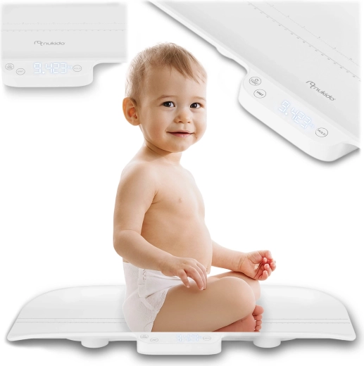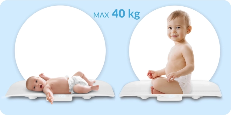 Ergonomicky tvarovaná, klenutá plocha se snadno čistí a je vyrobena z bezpečného ABS. Velký podsvícený LCD displej zajišťuje jasnou čitelnost. Praktické je i přepínání jednotek mezi g, kg, oz a lb. Integrovaná měrka do 60 cm pomůže orientačně sledovat růst dítěte a nosnost až 40 kg zaručí využití váhy i v dalších letech.