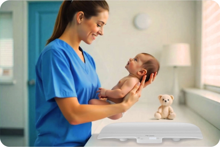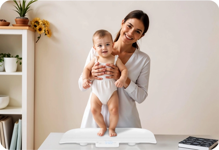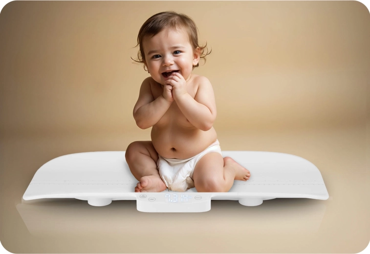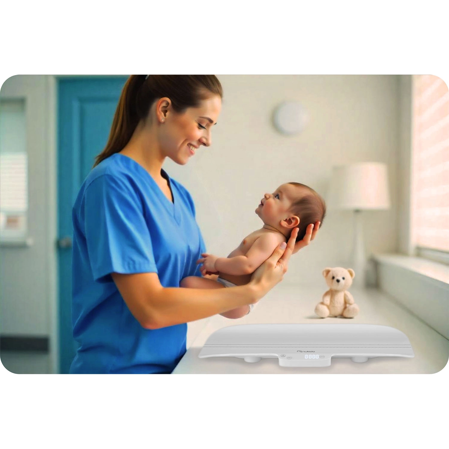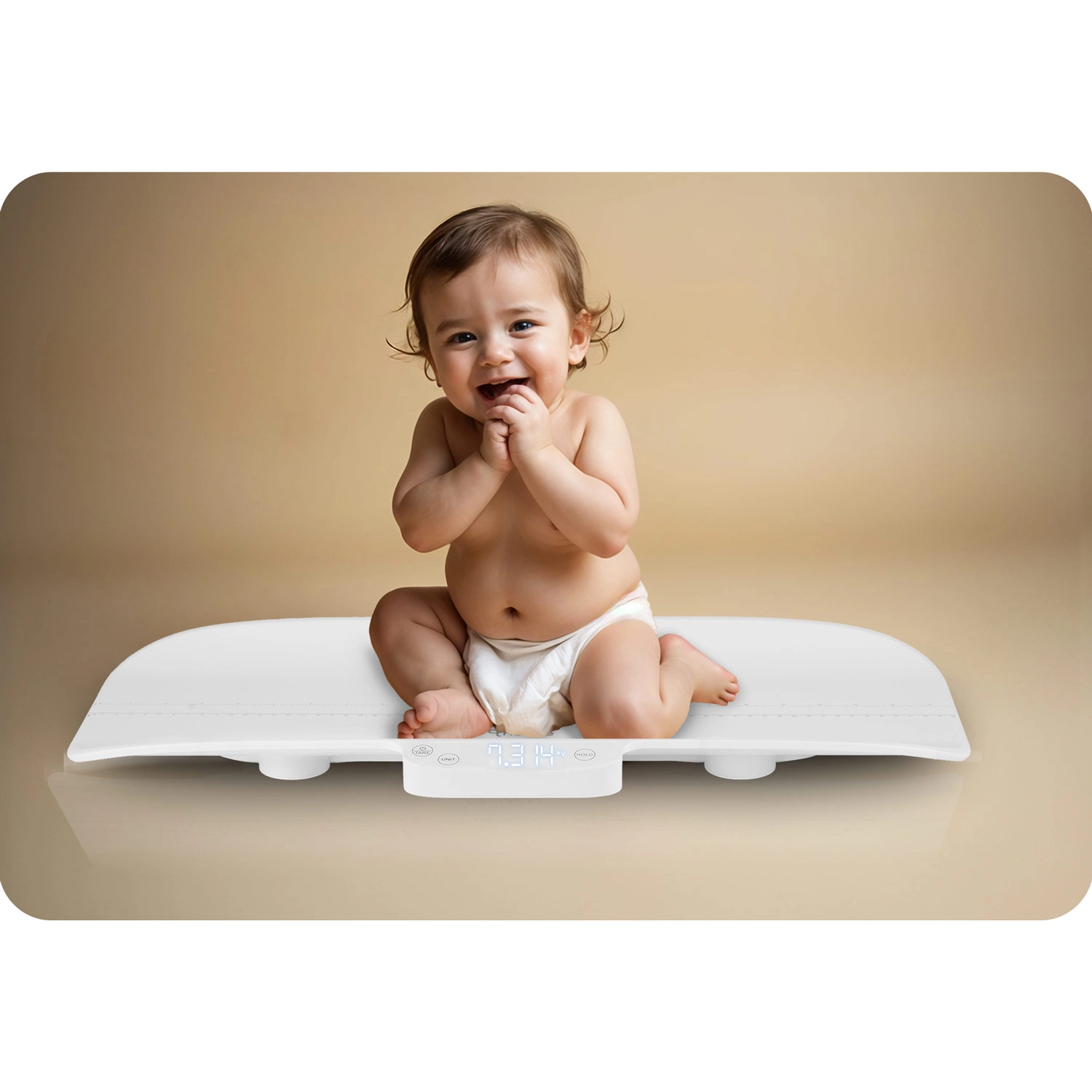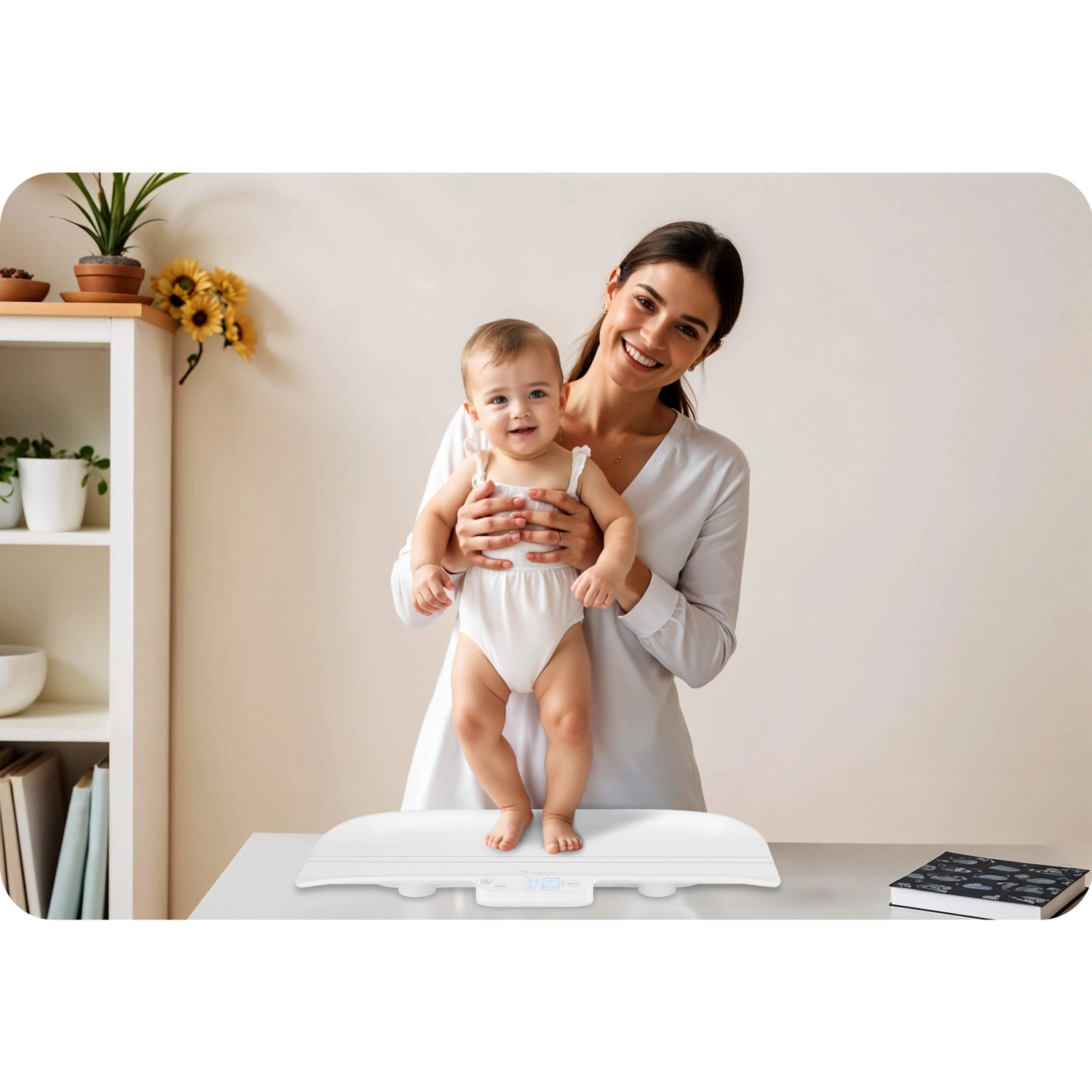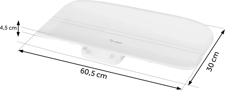 Ergonomicky tvarovaná plocha s integrovaným pravítkem umožní orientačně měřit délku a zajistit správné uložení miminka při vážení.