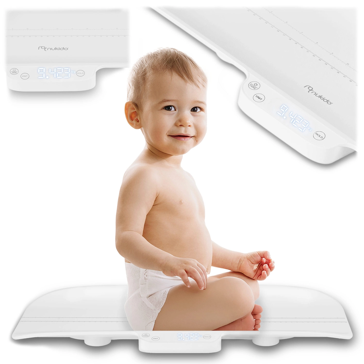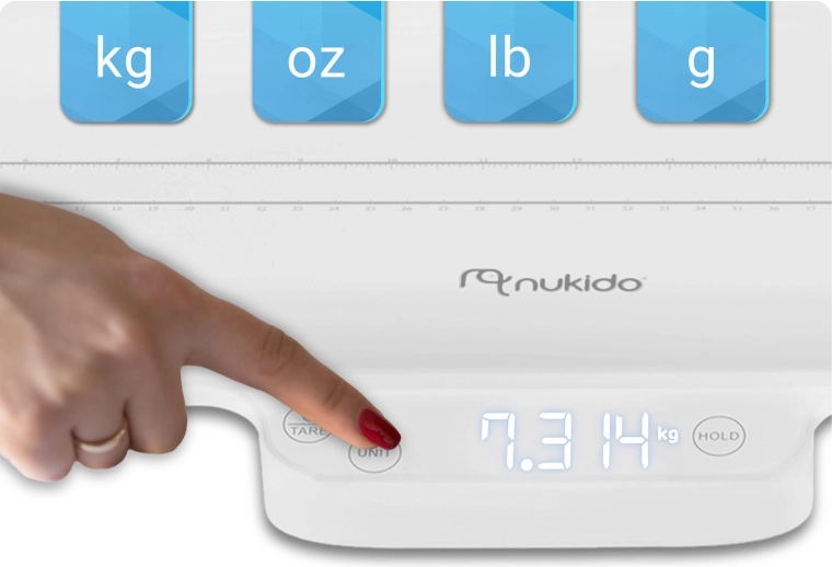 Elektronická váha NUKIDO pomáhá rodičům přesně sledovat vývoj dítěte už od narození. Přesnost 5 g (0,005 kg) zachytí i ty nejmenší změny hmotnosti – ideální pro kojené děti, nedonošence i pro pravidelné domácí vážení. Manuální funkce HOLD uzamkne hodnotu na displeji, i když se miminko pohne, a TARE umožní odečíst deku či plenku.