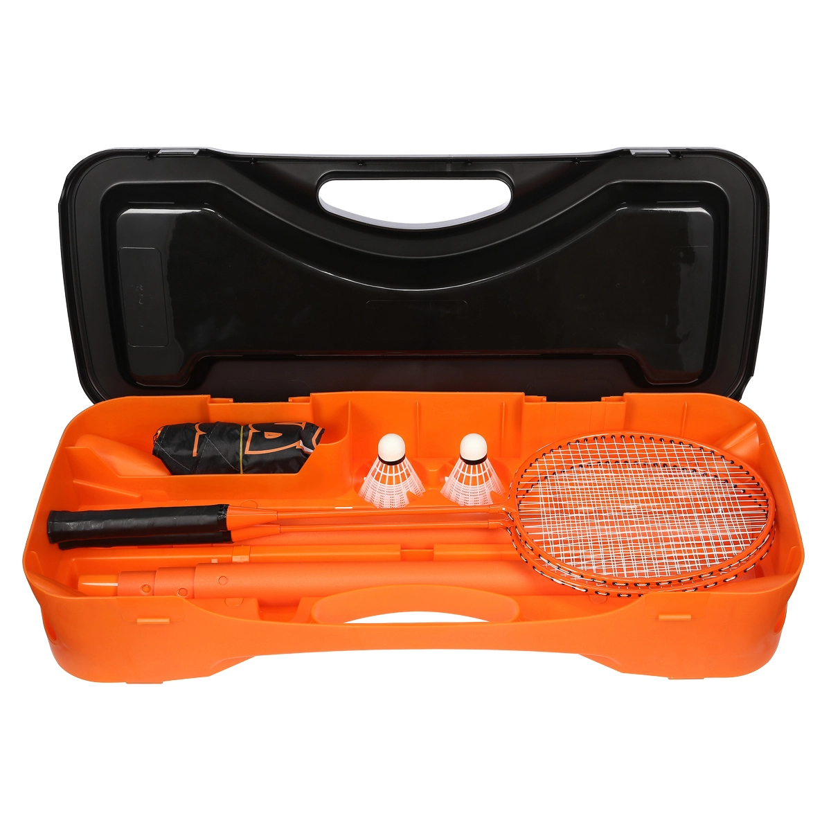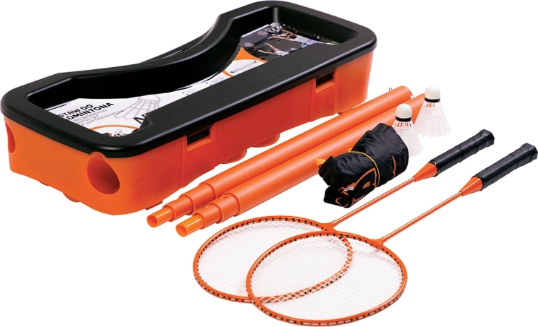Pevné plastové pouzdro s přihrádkami udrží síť, sloupky, rakety i letky přehledně a bezpečně. Snadno se přenáší a rychle připravíte hru kdekoli.