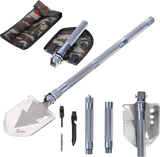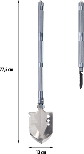 Univerzální outdoorová lopatka, která kombinuje sílu, odolnost a nízkou hmotnost. Vyrobená z nerezové oceli a hliníku nabízí širokou škálu funkcí – od rýče, motyky a pily až po nůž, křesadlo, šroubováky a píšťalku. V rozloženém stavu je stabilní a efektivní, po složení kompaktní a snadno přenosná v přiloženém pouzdře – ideální pro kempování, turistiku i nouzové situace.