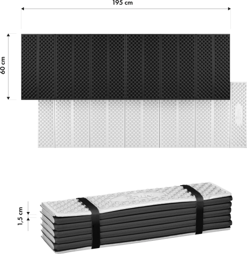 Skládací „harmonika“ šetří místo v batohu a upevňovací popruhy drží karimatku kompaktně při přepravě. Velkorysé rozměry 195 × 60 cm a tloušťka 1,5 cm poskytují pohodlnou oporu i vyšším postavám.