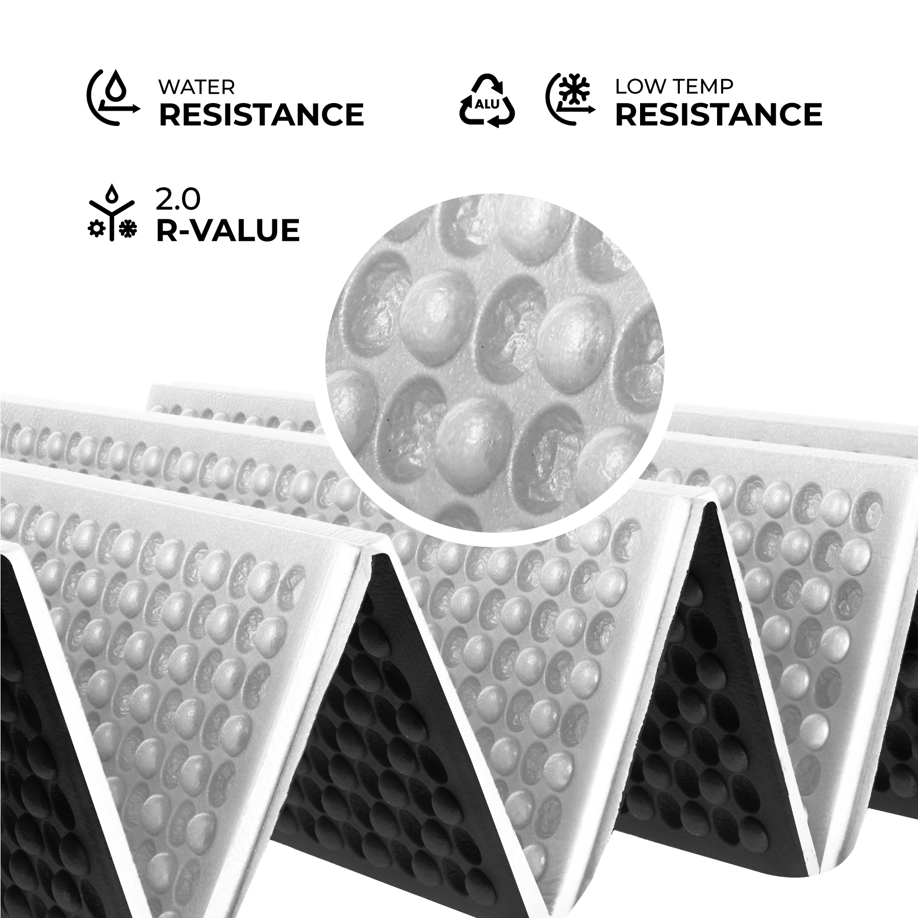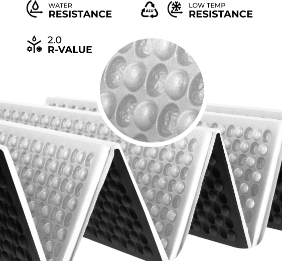 Reflexní vrstva funguje chytře podle umístění: při ležení na straně s fólií odráží teplo zpět k tělu, při otočení dolů izoluje od chladu země. Díky tomu je karimatka ideální pro tři roční období – od chladnějších nocí ve stanu po letní bivaky pod širákem.