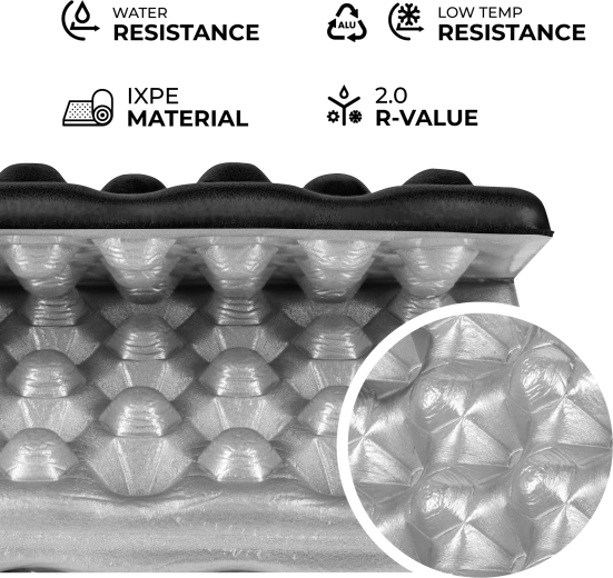 Sedátko NILS Camp z pěny IXPE kombinuje nízkou hmotnost s odolností a dlouhou životností. Jedna strana je opatřena hliníkovou reflexní vrstvou, která podle orientace buď odraží teplo zpět k tělu, nebo izoluje od chladu země. Materiál IXPE je nenasákavý, pružný a snadno se čistí.