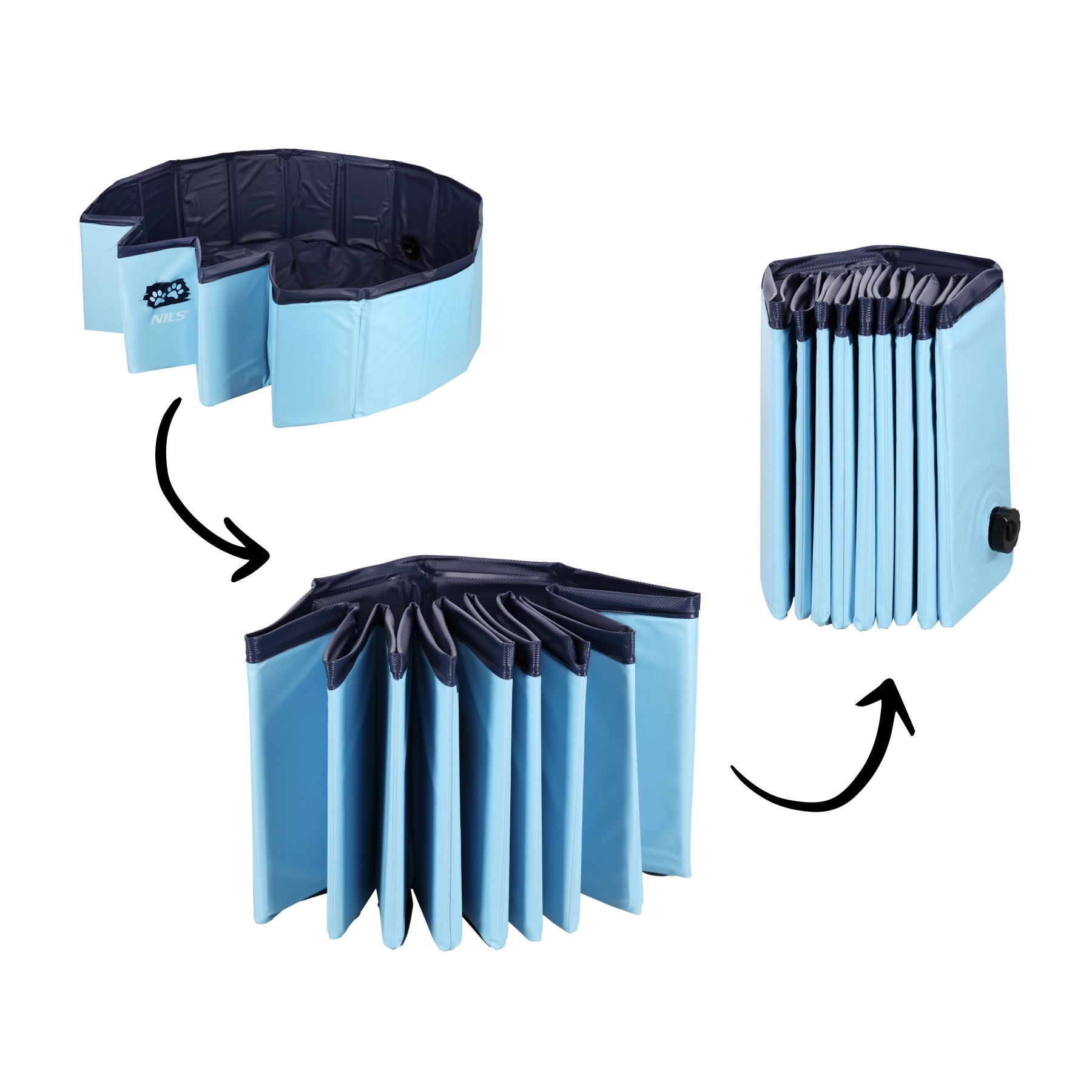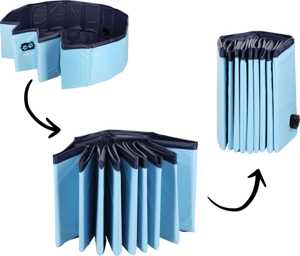 Skládací bazén pro psy NILS je skvělou volbou pro horké dny na zahradě, terase i balkonu. Díky pevnému PVC a vnitřním výztuhám z MDF si udržuje tvar a stabilitu i při divočejších vodních hrátkách. Nenafukovací provedení zaručuje rychlé použití – jednoduše rozložíte, naplníte a zábava může začít.