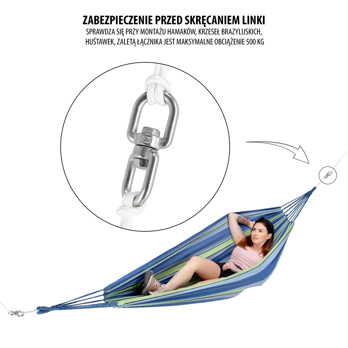 Otočné oko NILS Camp účinně brání kroucení lan a tím zvyšuje komfort i bezpečnost při houpání. Je ideální pro závěsná křesla, houpací sítě a další zavěšené vybavení, kde je vyžadována plynulá rotace bez namáhání uzlů a kotvících prvků.