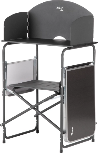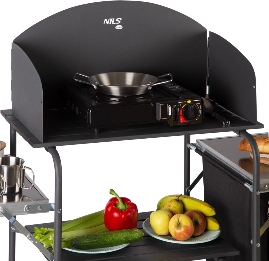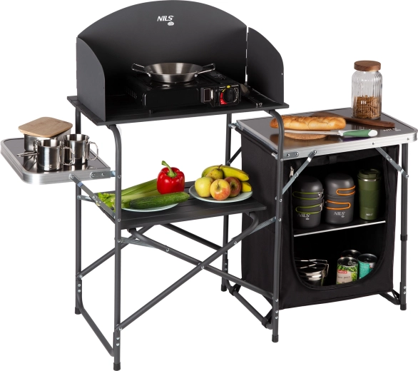 Praktická kempingová kuchyňská skříň se závětřím od NILS Camp nabízí stabilní pracovní plochu, ochranu proti větru pro vařič, dostatek úložného prostoru a rychlé skládání do přenosné tašky. Ideální pro kempování, pikniky i zahradní vaření.