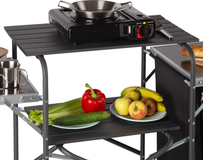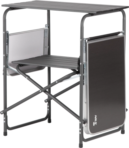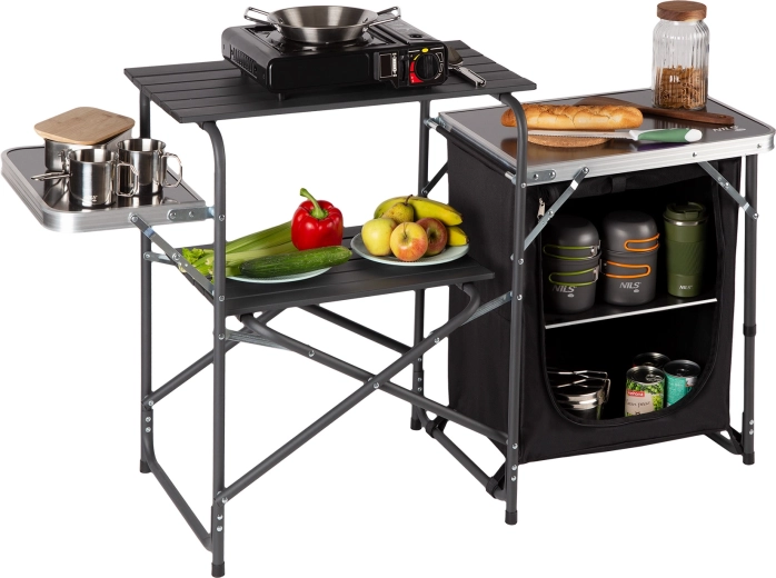 Kompaktní a stabilní kempingová skříň NILS Camp je skvělým řešením pro všechny, kteří chtějí mít během kempování vše na dosah ruky. Integrované boční desky s hliníkovým rámem jsou odolné vůči povětrnostním vlivům a snadno se čistí, zatímco prostorné police a skříňka na zip udrží vaše potraviny a nádobí přehledně a v bezpečí.