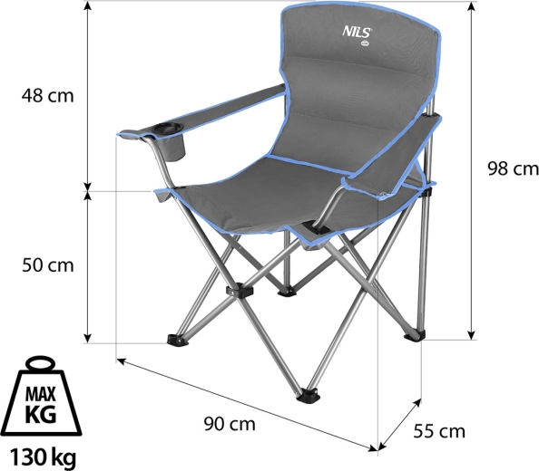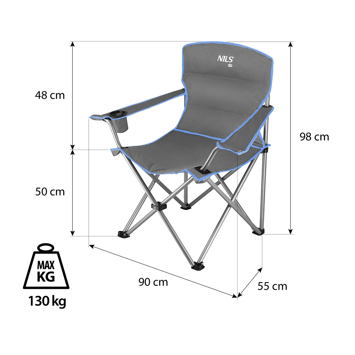 Odolná a pohodlná kempingová židle NILS Camp v šedo‑modré barvě nabízí pevnou ocelovou konstrukci, potah Oxford 600D, nosnost až 130 kg a praktický držák nápoje. Díky rychlému skládání a přiloženému vaku s popruhem je ideální k vodě, na ryby, festivaly i kempování.