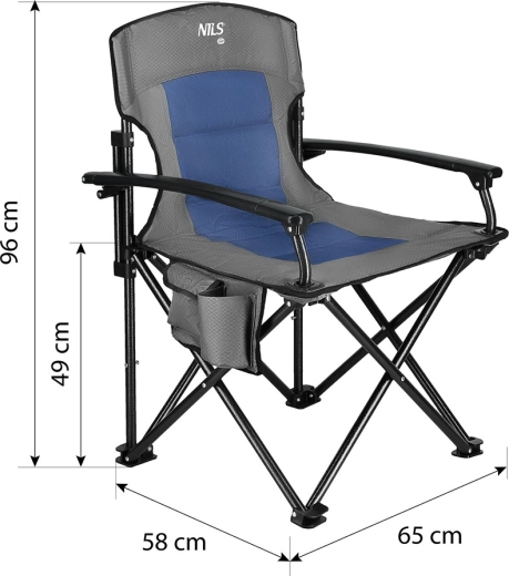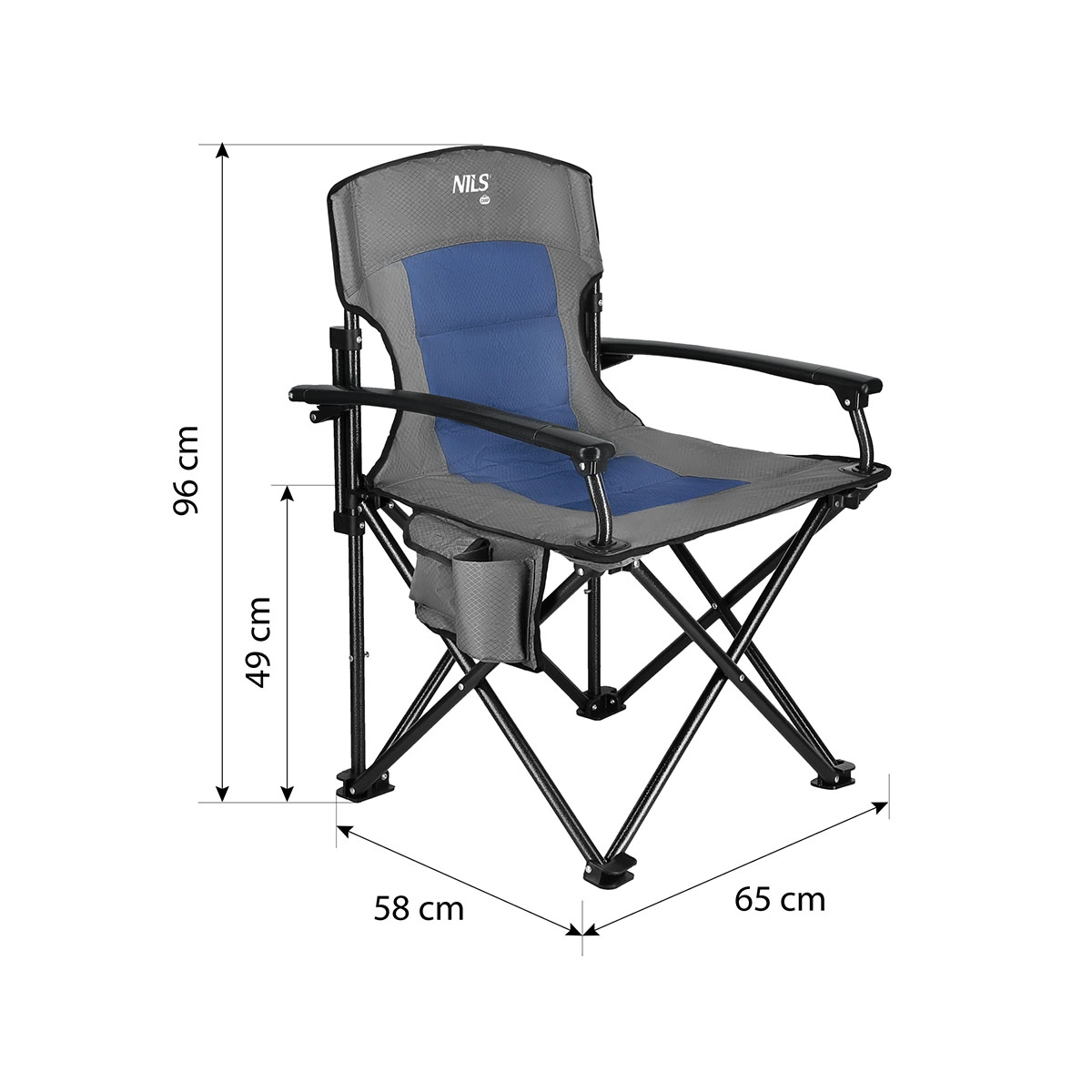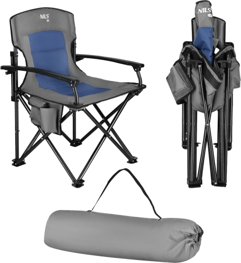 Užijte si pohodlí kdekoliv s odolným a polstrovaným skládacím kempingovým křeslem NILS Camp. Nabízí pevnou ocelovou konstrukci, plnohodnotné područky, praktické kapsy včetně držáku nápojů a nosnost 120 kg. Díky přenosnému vaku s popruhem jej snadno sbalíte a vezmete na ryby, k vodě, na festival i na kemp.