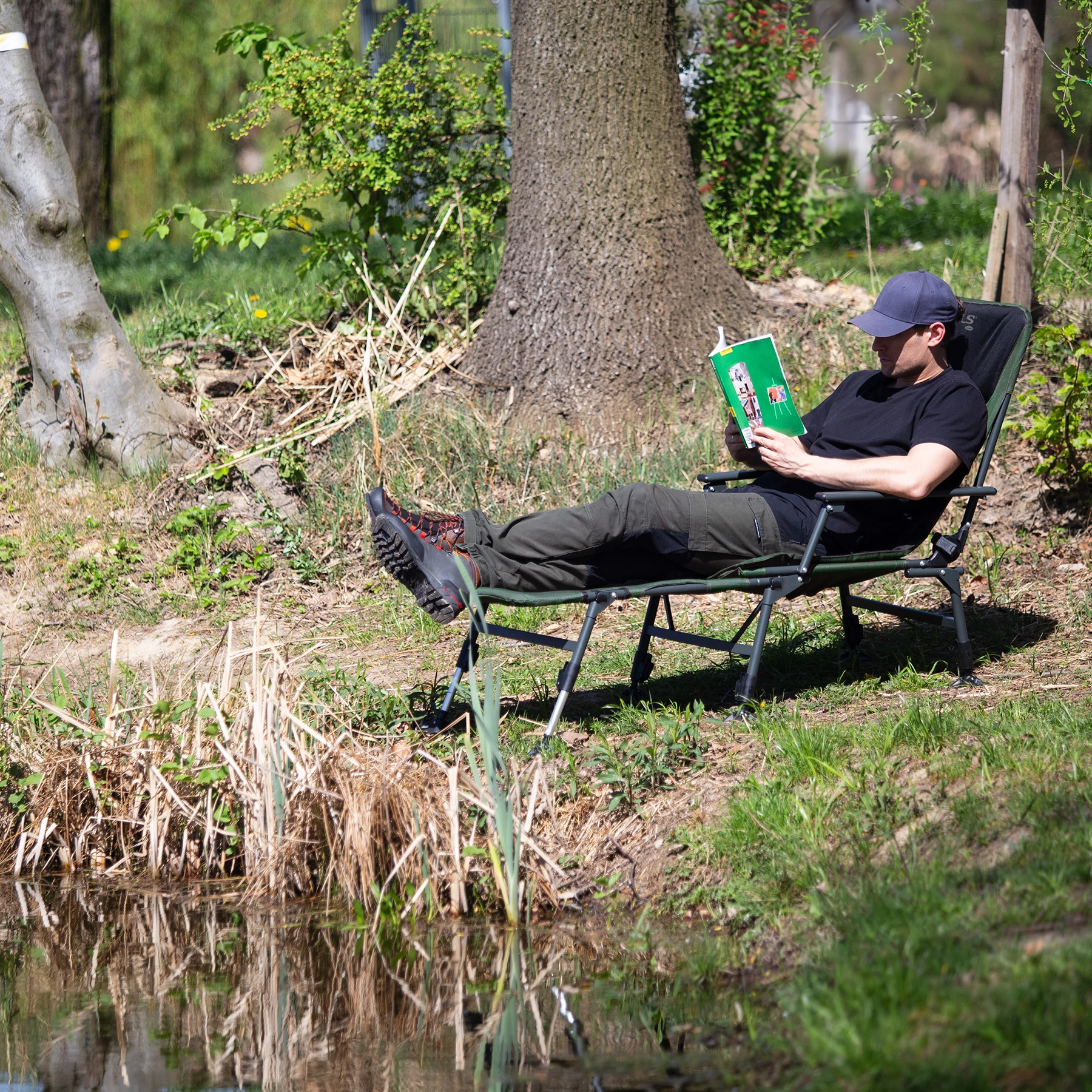 Plynulé nastavení opěradla a odnímatelná podnožka promění křeslo v pohodlné lehátko – ideální na delší čekání u vody i odpočinek po túře.