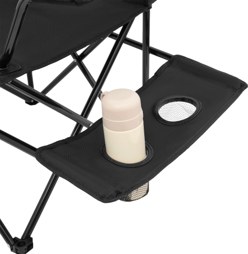Integrovaný stolek se dvěma košíky a další držák v područce udrží nápoje i drobnosti bezpečně a přehledně – ideální pro kempování, rybaření i festivaly.