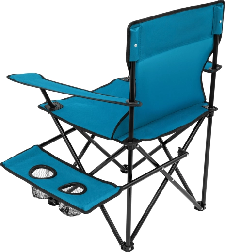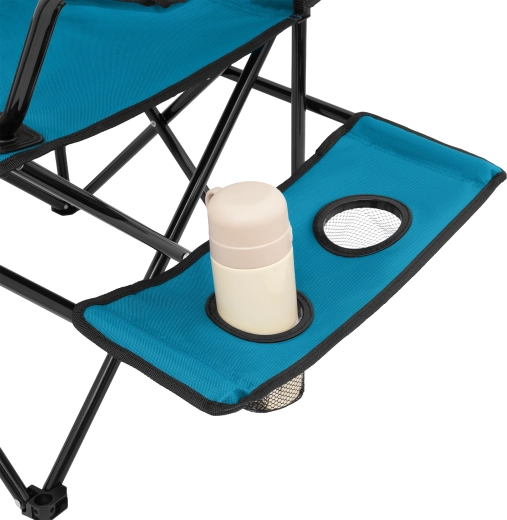 Promyšlené doplňky zvyšují komfort při každém posezení: v opěrce ruky je vestavěný držák na kelímek či láhev a praktický boční stolek přidává další dva košíky na nápoje a drobnosti. Židle se během chvilky složí do kompaktního tvaru a včetně přiloženého vaku s uchem ji snadno přenesete i uskladníte.