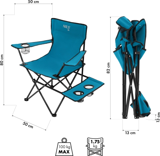 Tato skládací kempingová židle NILS Camp je ideální volbou pro kempování, rybaření, festivaly i relax na zahradě. Odolný potah z polyesteru 600D s PE zátěrem chrání před vlhkostí a opotřebením, zatímco práškově lakovaný ocelový rám zajišťuje stabilitu a nosnost až 100 kg.
