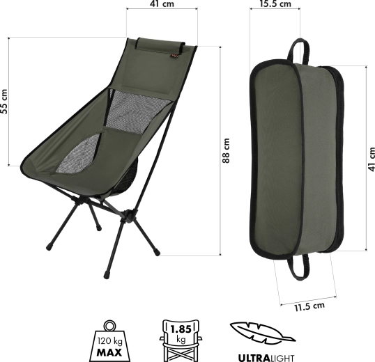 Přestože je konstrukce pevná, křeslo váží jen 2,47 kg a složí se do pouhých 41 × 15,5 × 11,5 cm. Transportní obal je součástí balení, takže křeslo snadno uložíte do auta či batohu. Perfektní volba pro každodenní outdoor – od kempování přes stanování až po festivaly.